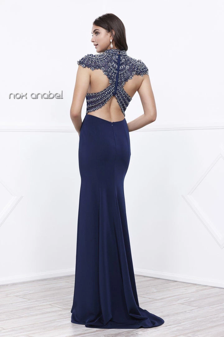 Fall in love with this long navy blue dress with sheer embellished back and shoulders by Nox Anabel Style Number 8293. This long evening gown features a V-neck bodice decorated, sheer bead embellished coverlet, lovely beaded sheer back, a playful cutouts for a touch of sexiness, long skirt that forms a mini train, and a zipper closure.