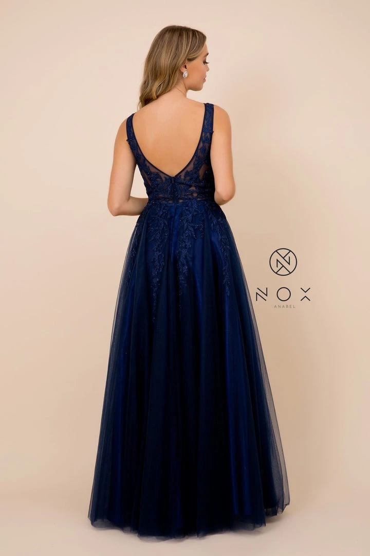 Show off your fashion sense in this long A-line tulle dress with embroidered lace bodice by Nox Anabel A381.