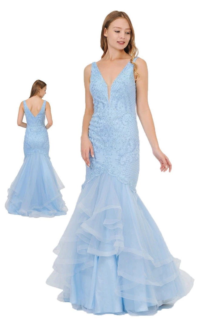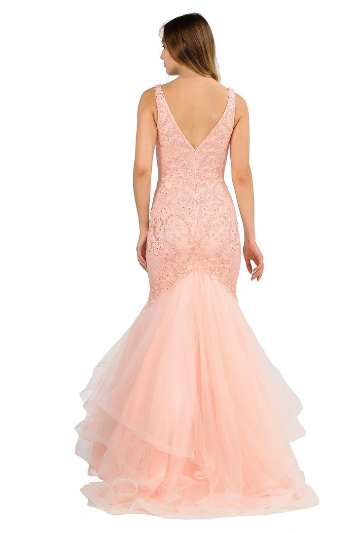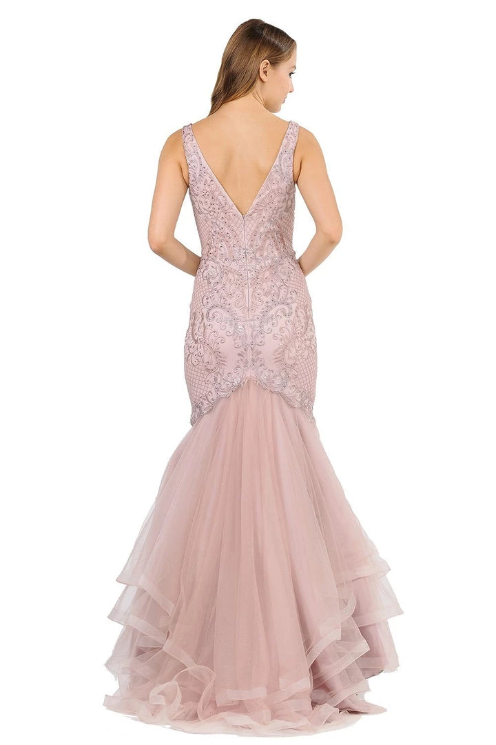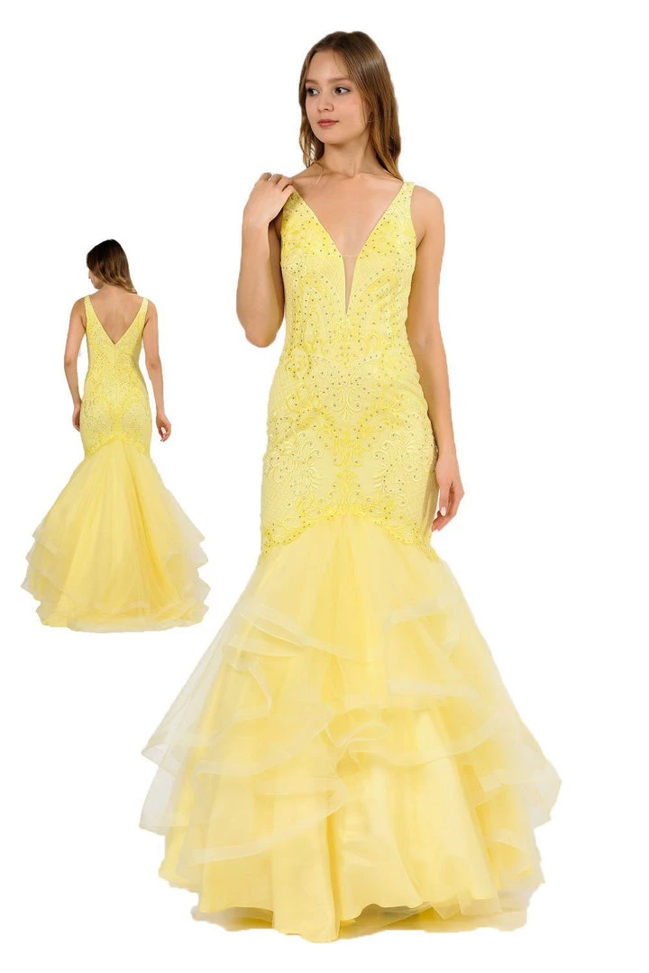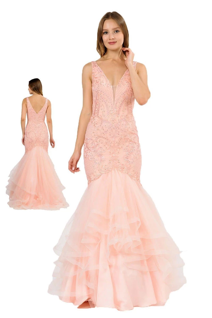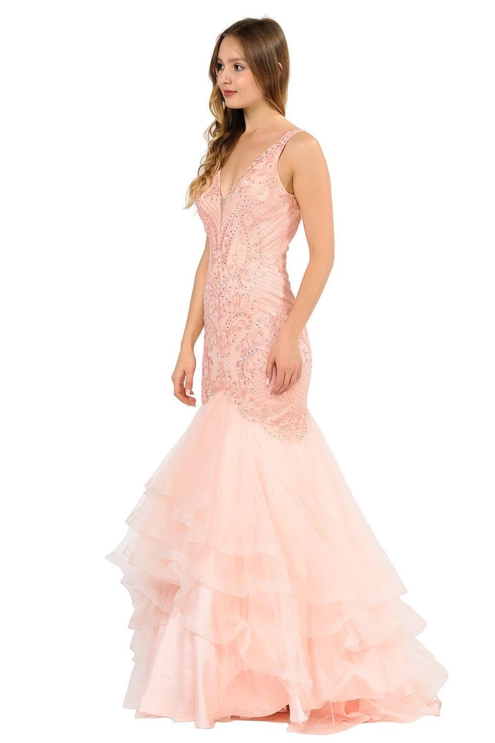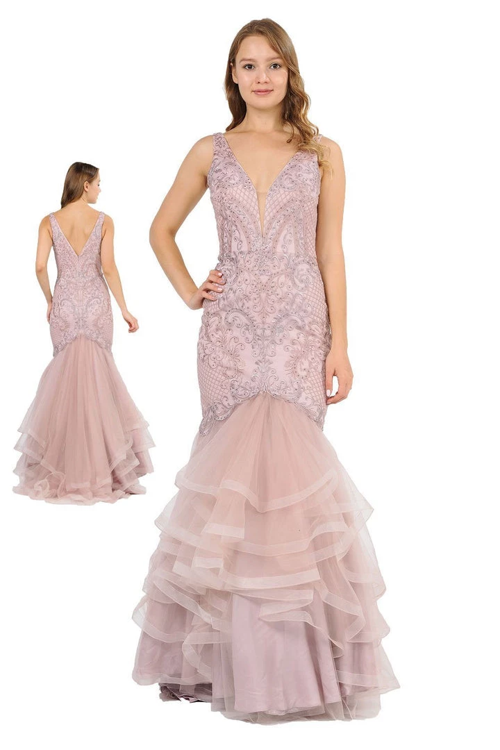 Look vintage chic in this long deep V-neck mermaid dress with tiered skirt by Poly USA 8320. This beautiful formal gown features a sleeveless bodice adorned with embroidery accented with rhinestones, illusion inset panel, flirty open back, floor length tiered mermaid skirt with horsehair hemline, and a zipper closure. Affordably priced under $300, this long evening dress is perfect for any formal event and will keep you on budget!