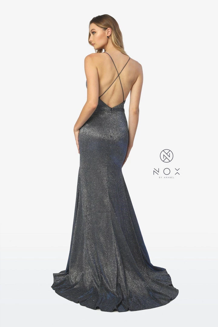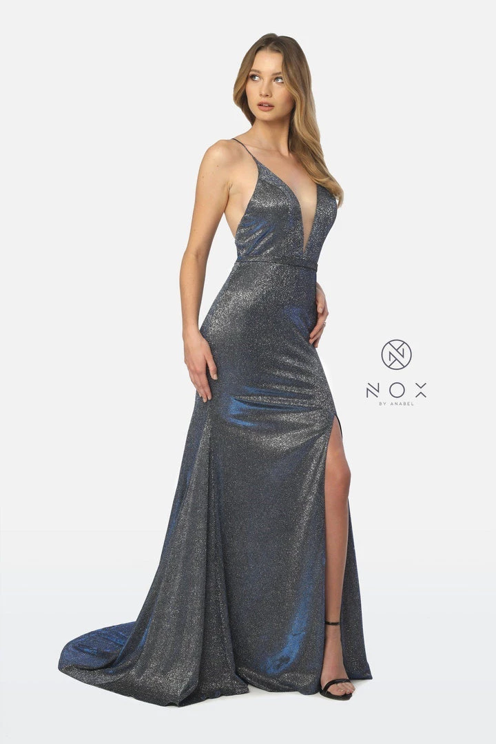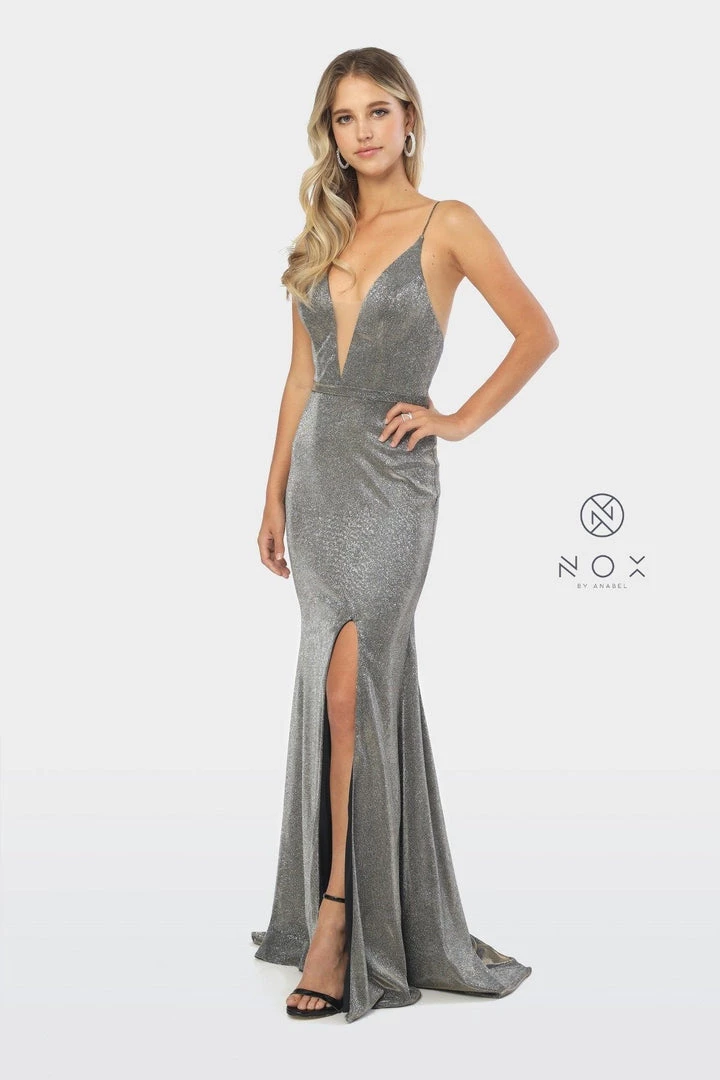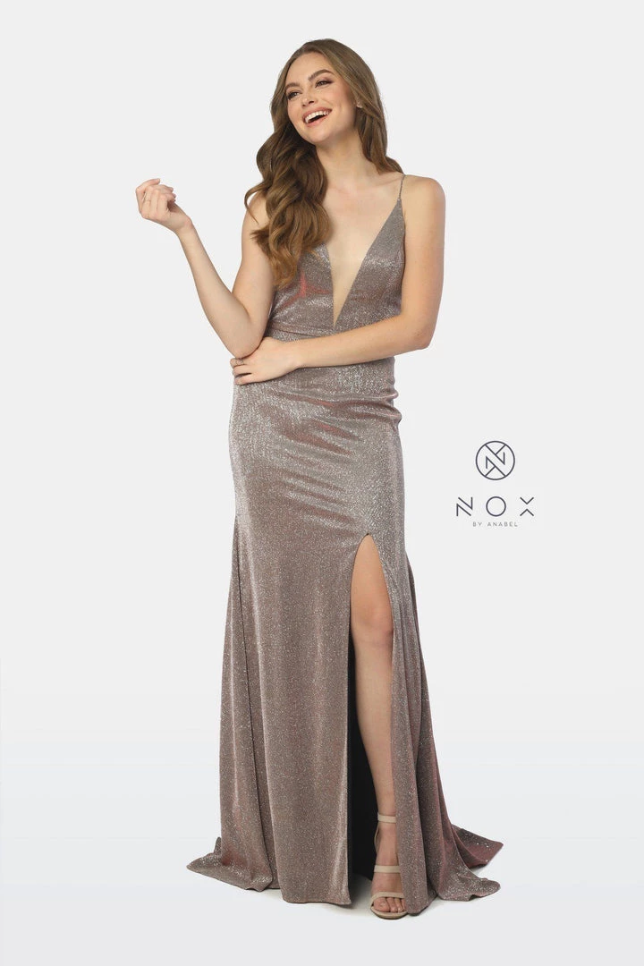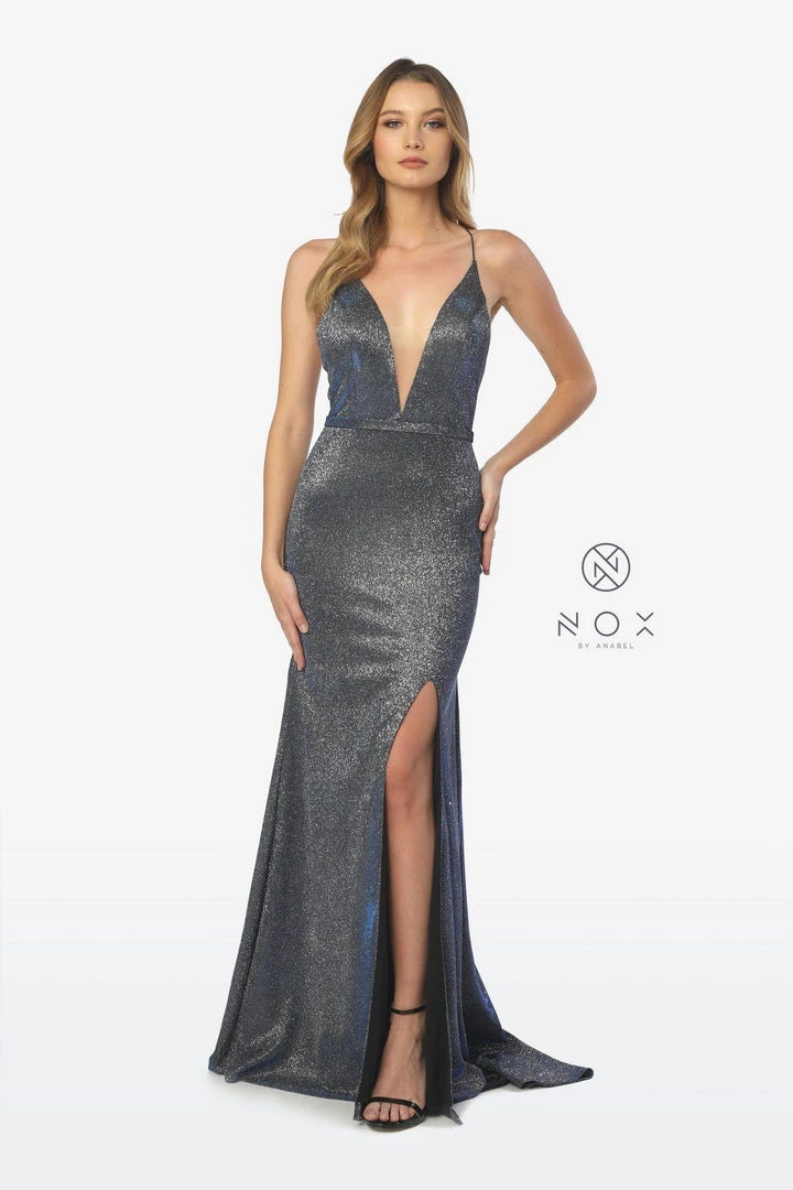 All eyes will be on you in this shimmering long V-neck glitter dress with sexy leg slit by Nox Anabel C238.