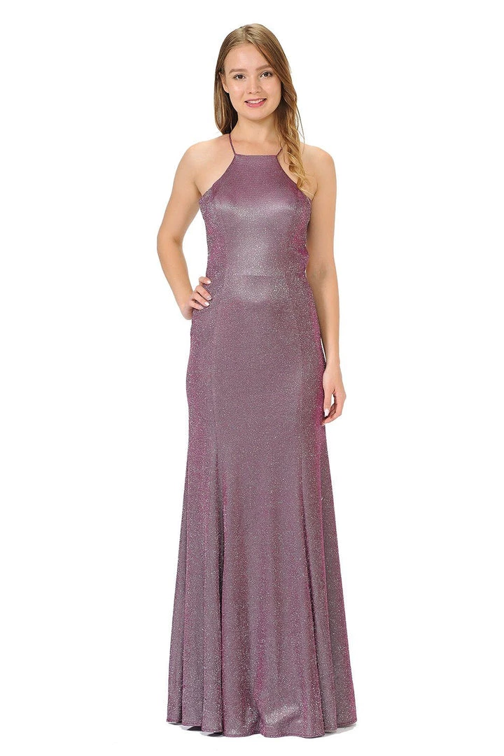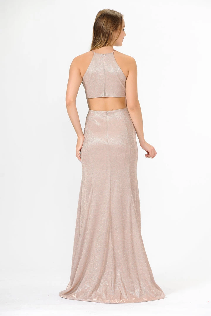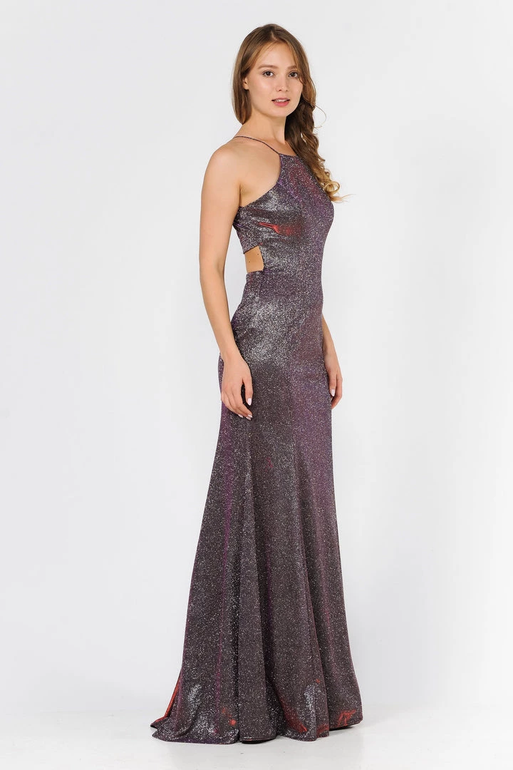 Be the center of attention in this long glitter high-neck dress with open back cut-out by Poly USA 8386. This beautiful formal gown features a sleeveless bodice, flirty open back with cut out, floor length form-fitting A-line skirt, and a zipper closure. Affordably priced under $200, this long evening dress is perfect for any formal event and will keep you on budget!