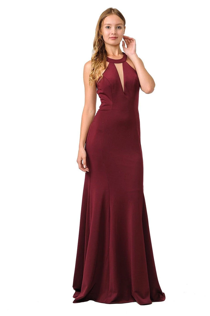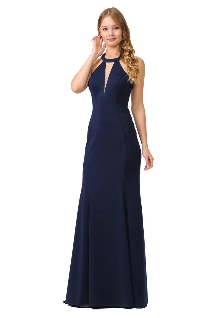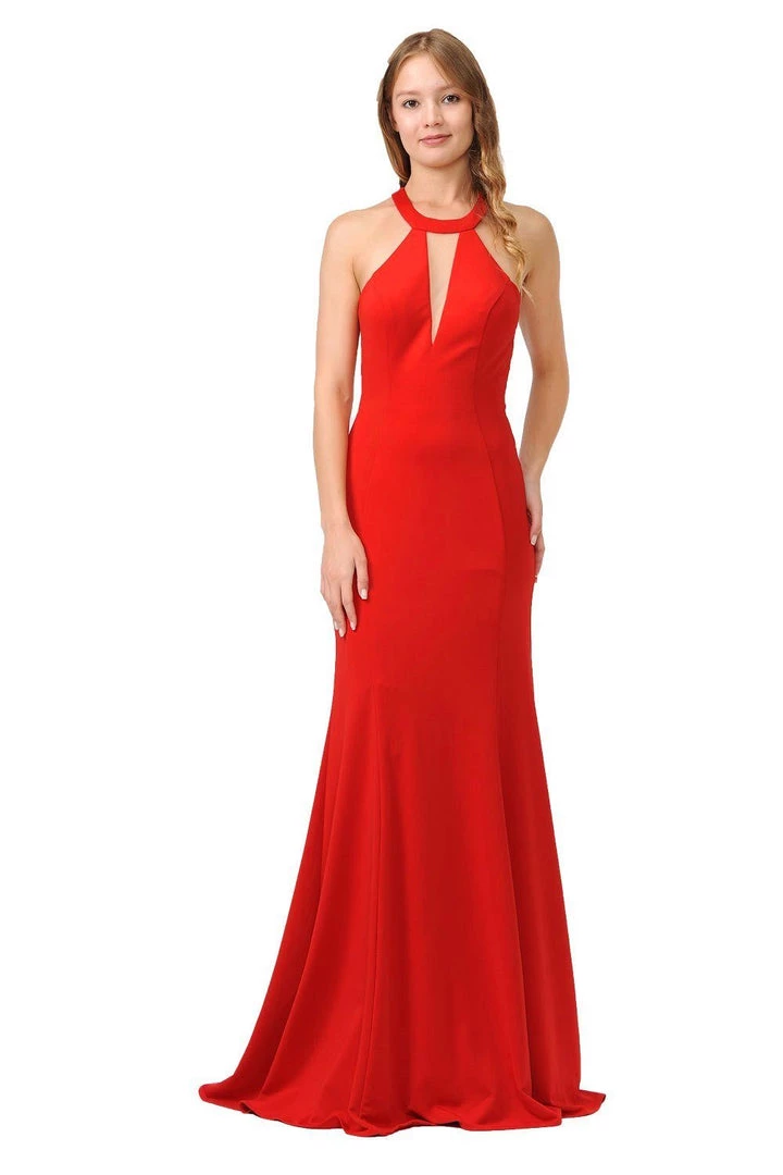 Be the center of attention in this long V-neck halter dress with mermaid train by Poly USA 8296. This beautiful formal gown features a high neck halter bodice with a sexy triangular cutout, flirty open strappy back, floor length mermaid skirt with sweep train, and a zipper closure. Affordably priced at $149, this long evening dress is perfect for any formal event and will keep you on budget!