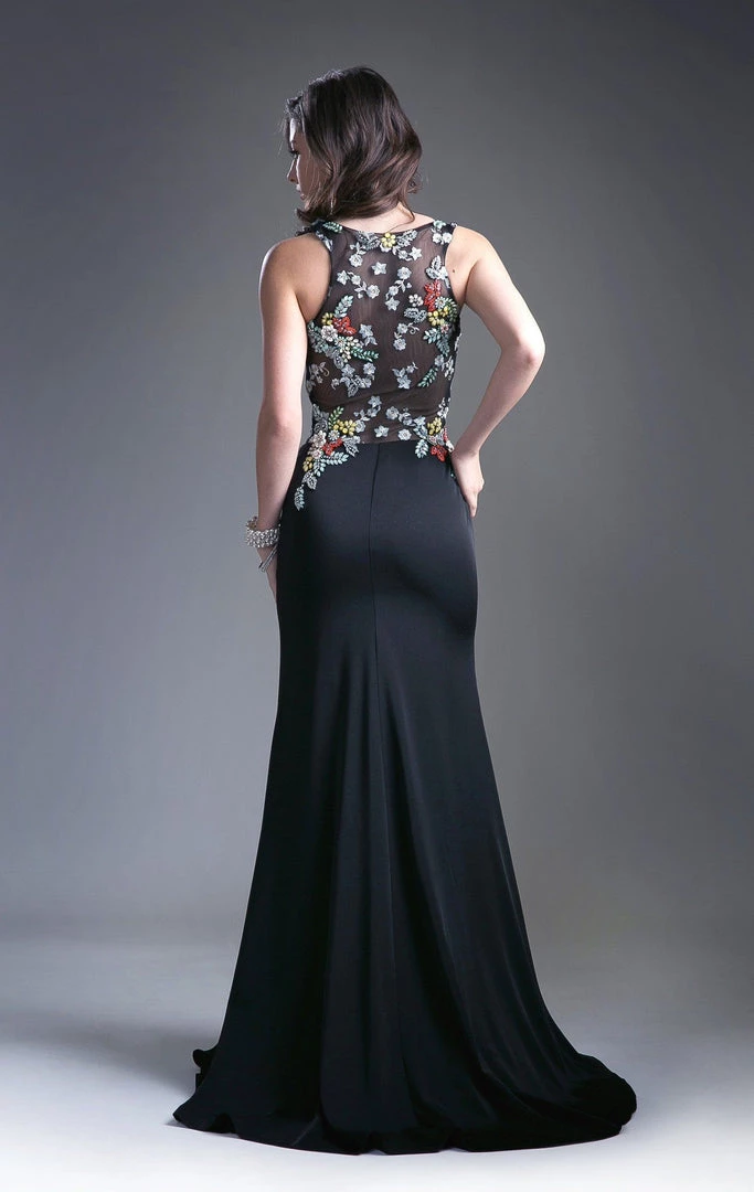 Look radiant in this black floral embroidered illusion dress with slit by Cinderella Divine 6395.