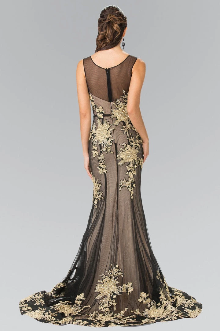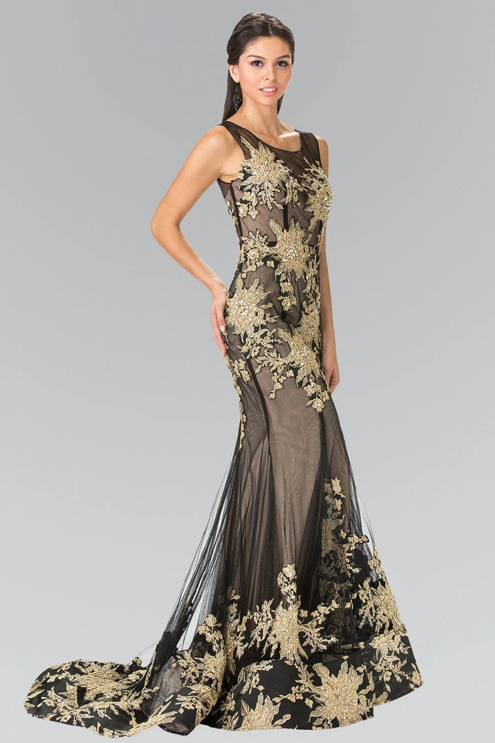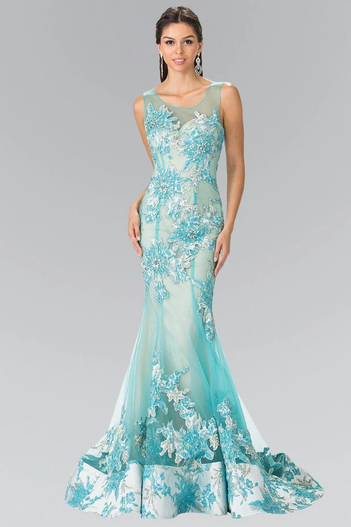 All eyes will be on you in this long sleeveless illusion mermaid gown with embroidery by Elizabeth K.