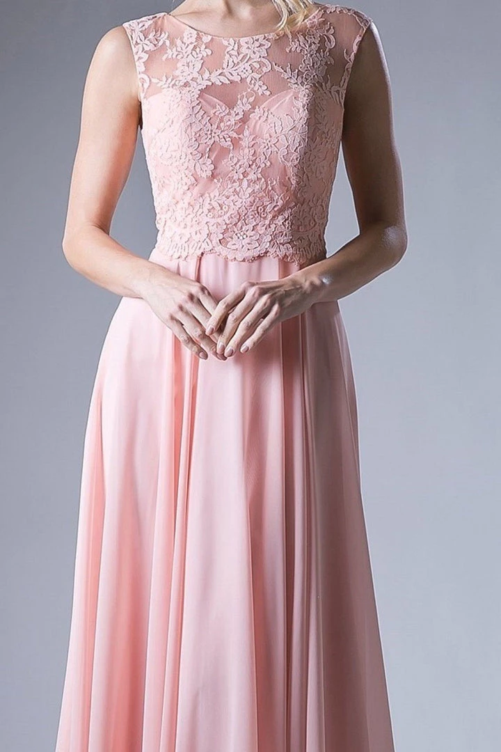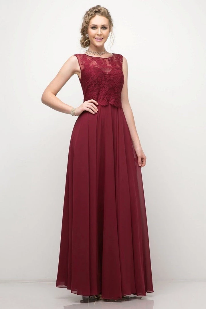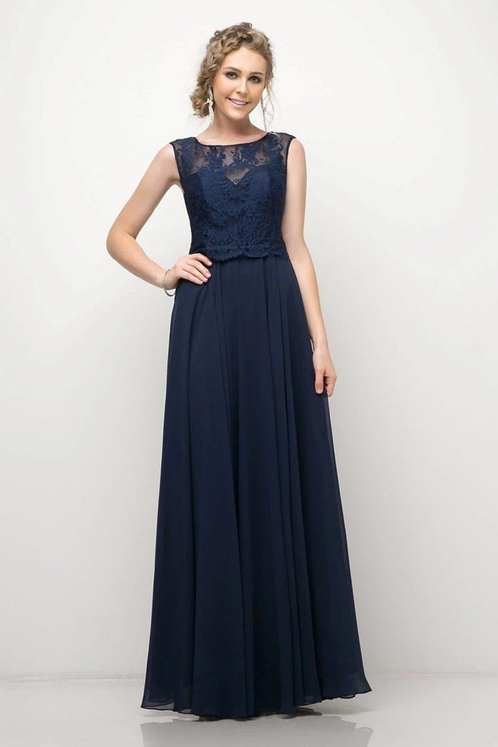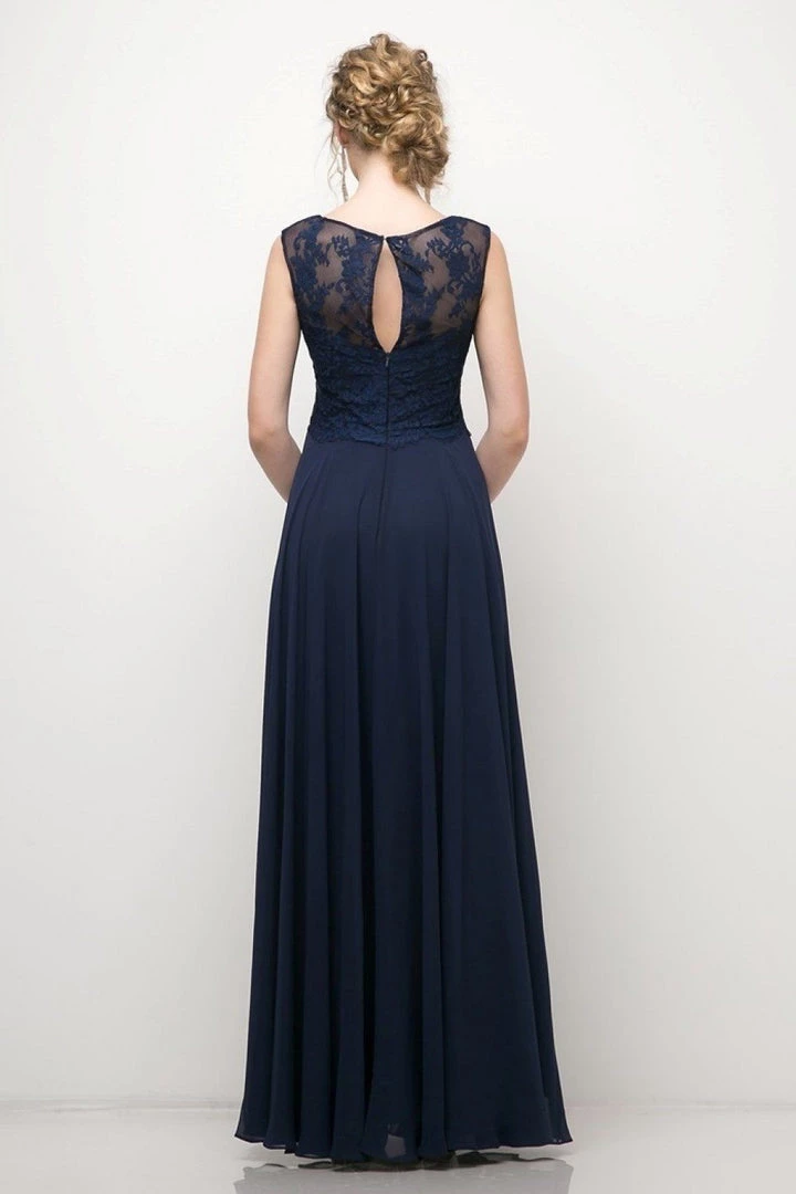 Captivate the room in this long sleeveless lace bodice dress with A-line chiffon skirt by Cinderella Divine CJ245.
