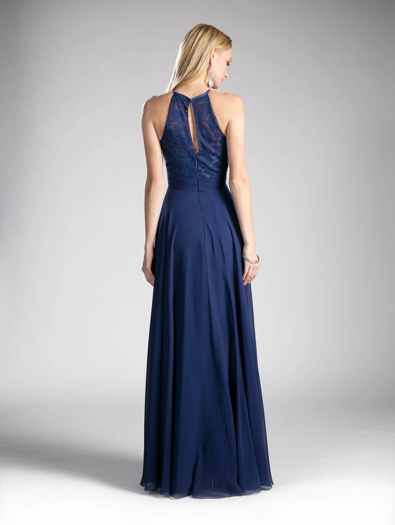 Look modest chic in this long keyhole halter dress with lace bodice by Cinderella Divine CJ228.