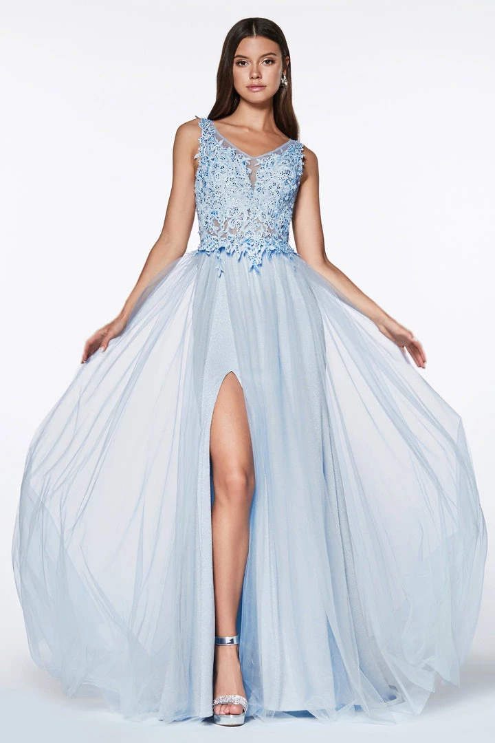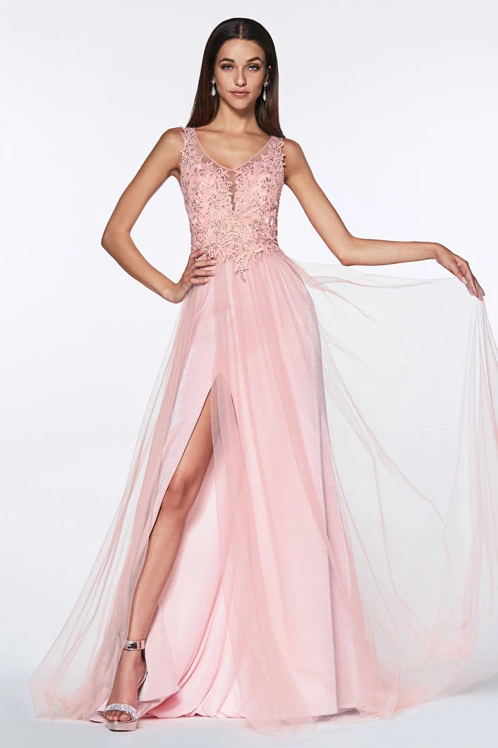 Look picture-perfect in this long sleeveless tulle A-line dress with lace bodice by Cinderella Divine KV1040. We love this A-line tulle gown with jeweled illusion lace bodice and leg slit!