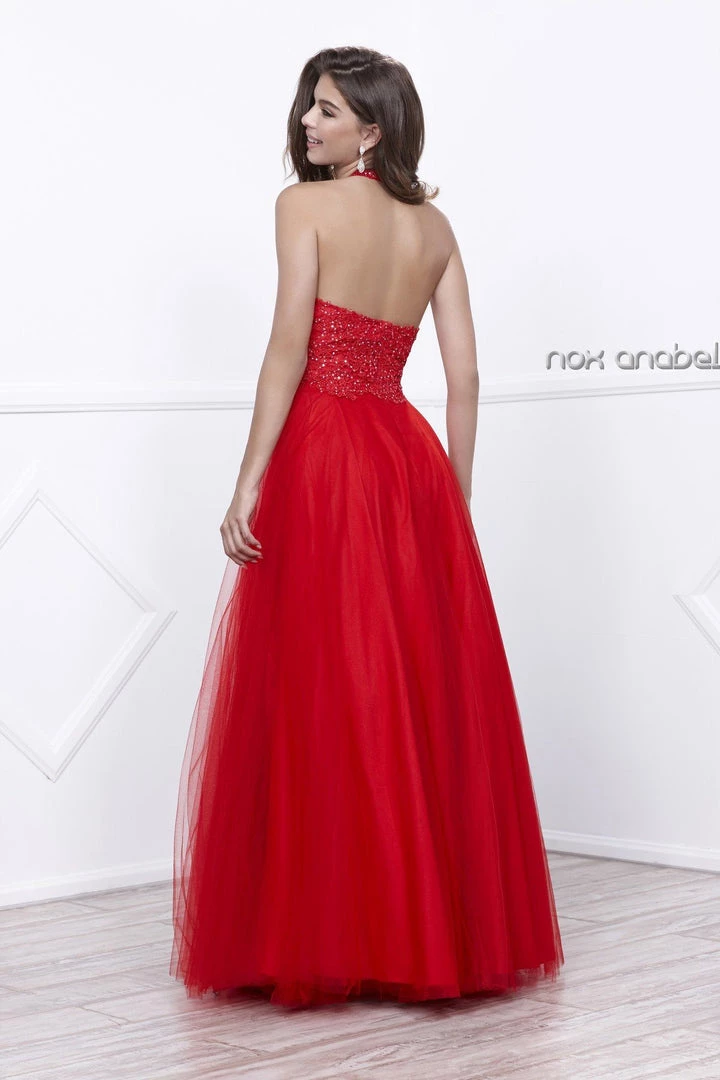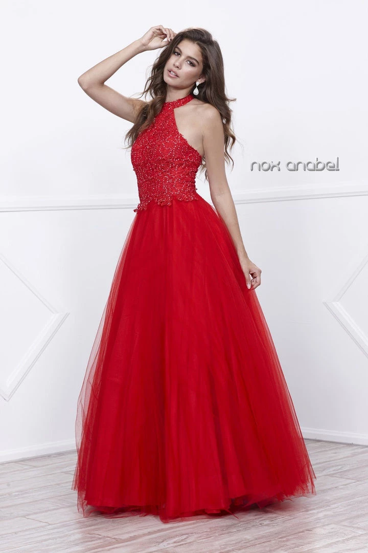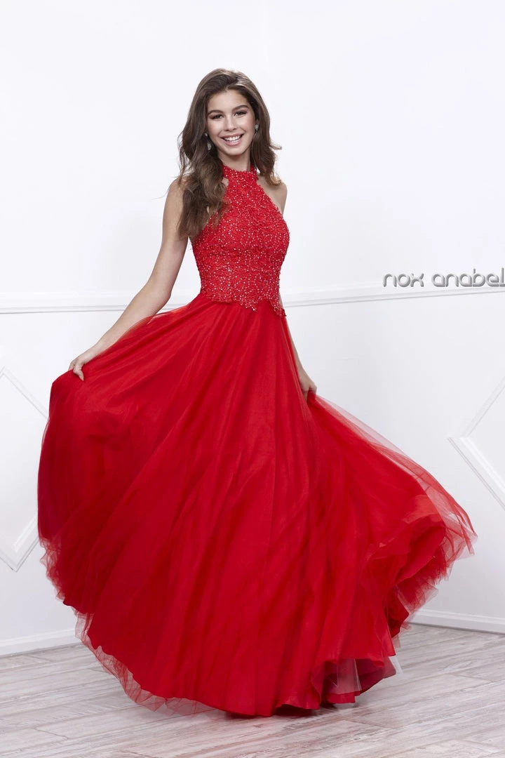 Fit for a fairy tale, you’ll love wearing this long halter lace embroidered dress by Nox Anabel Style Number 8181. This long evening gown features a high-neck halter bodice with a beautiful lace embroidery, floor length skirt that elegantly moves, and a zipper closure.