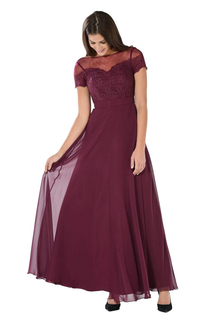 Beautiful and modest, dress to impress in this navy blue long A-line gown with short-sleeved lace bodice by Poly USA Style Number 7504. This evening dress features a short-sleeved illusion bodice embellished with lace appliques and stones. A sheer open V-shaped back, a long flowing A-line skirt, and a zipper closure complete this beautiful look. Affordably priced under $200, this dress is perfect for any formal event and will keep you on budget!