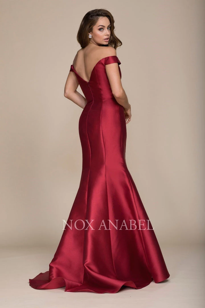 Look like a timeless beauty in this off-the-shoulder mermaid gown with open V-back by Nox Anabel C004. This mikado evening dress features a stunning off the shoulder bodice with short sleeves, deep V-neckline secured with sheer inset panel, alluring open V-back, the full length mermaid skirt ends with a gorgeous sweep train, and a zipper closure.