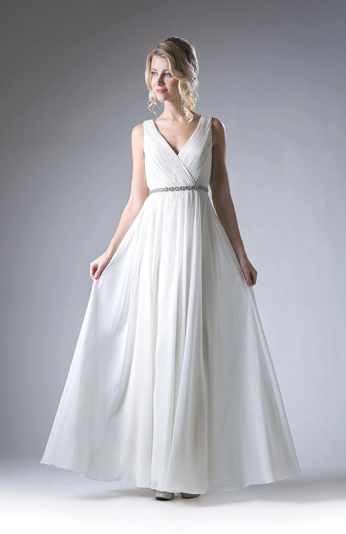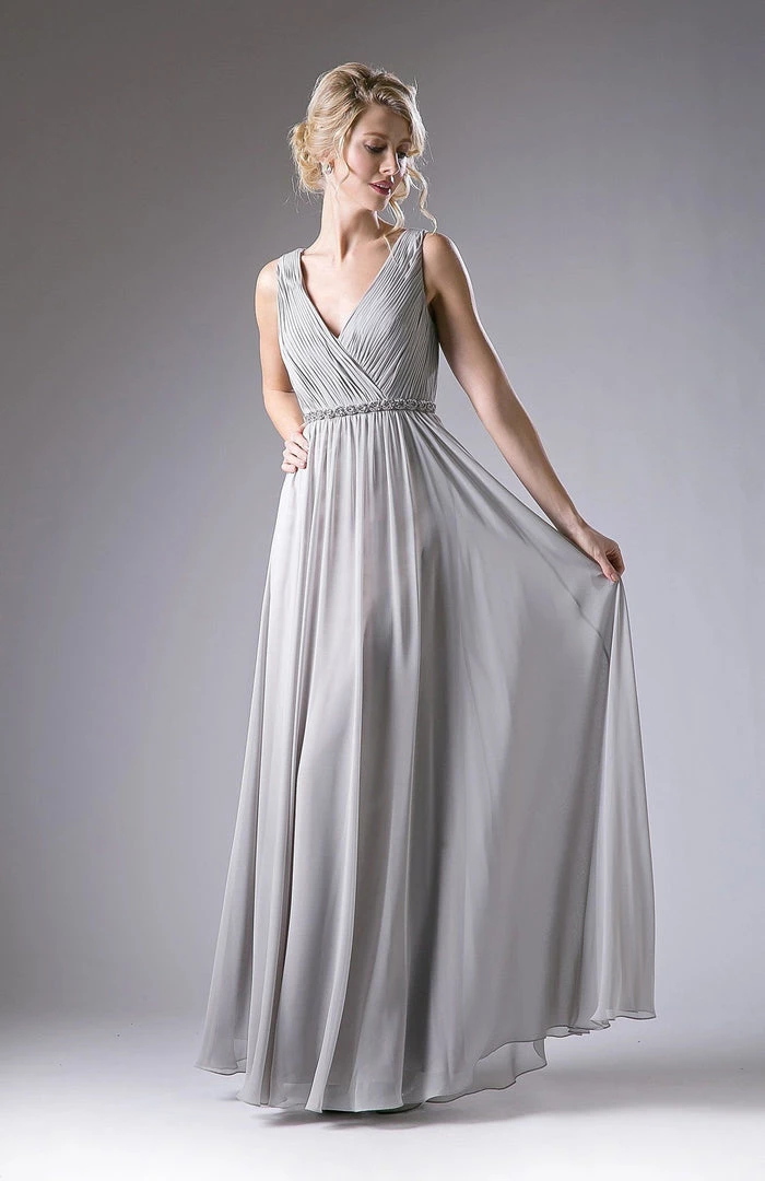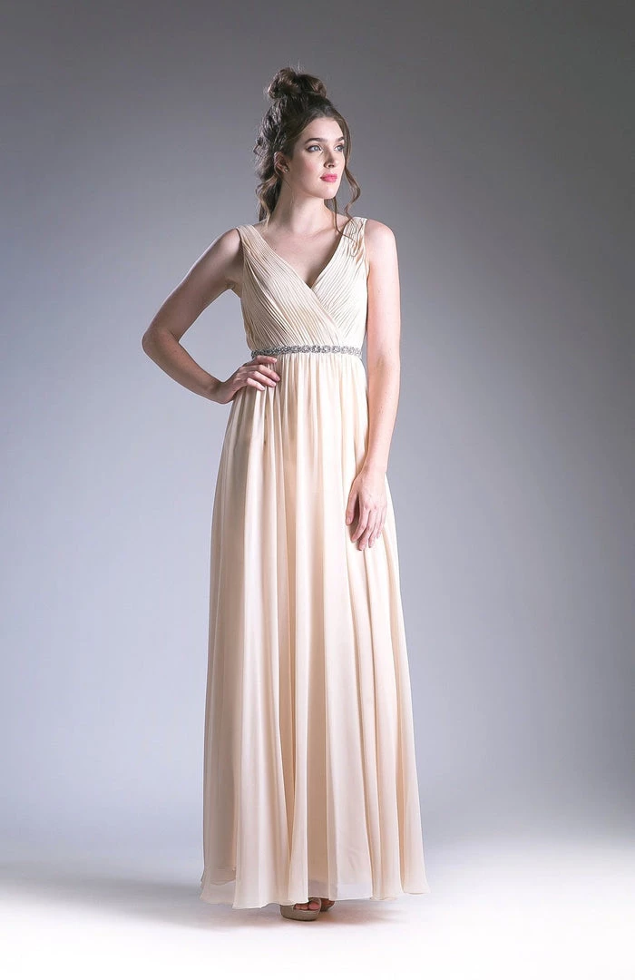 Dance the night away in this pleated long V-neck chiffon dress with A-line skirt by Cinderella Divine 1001.