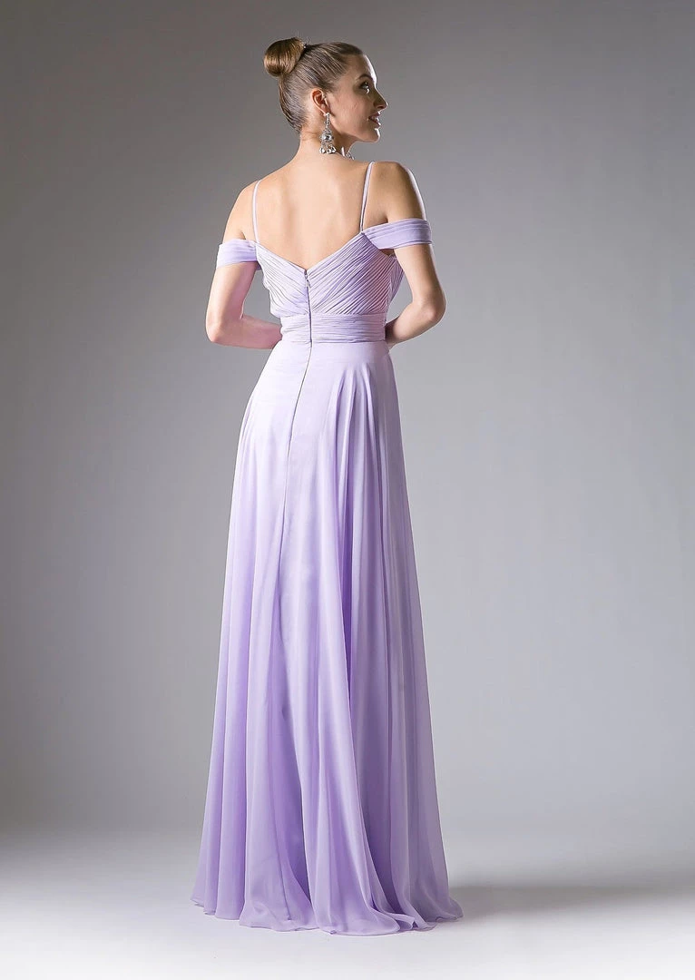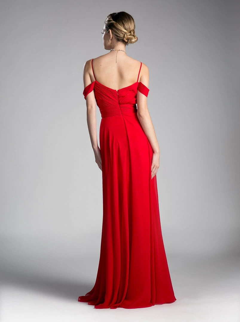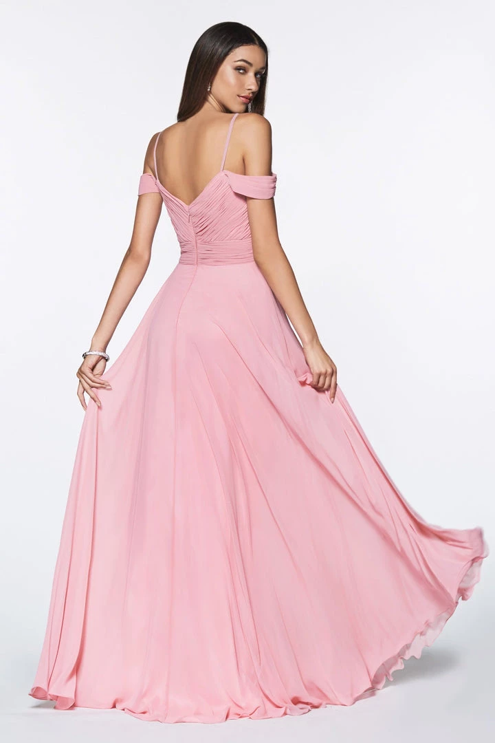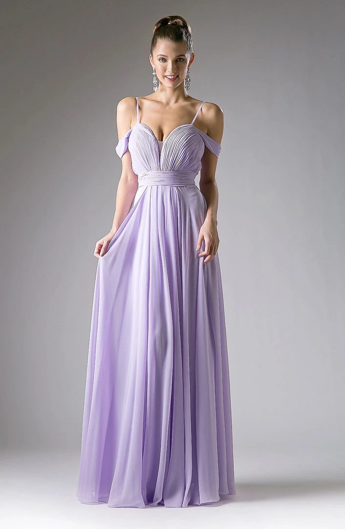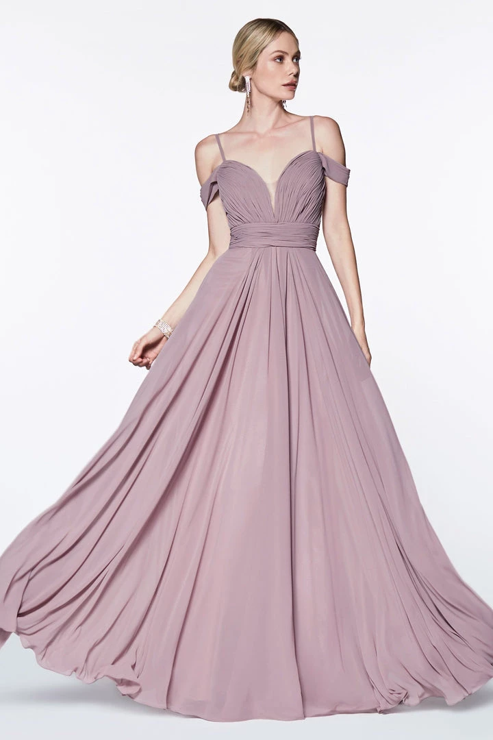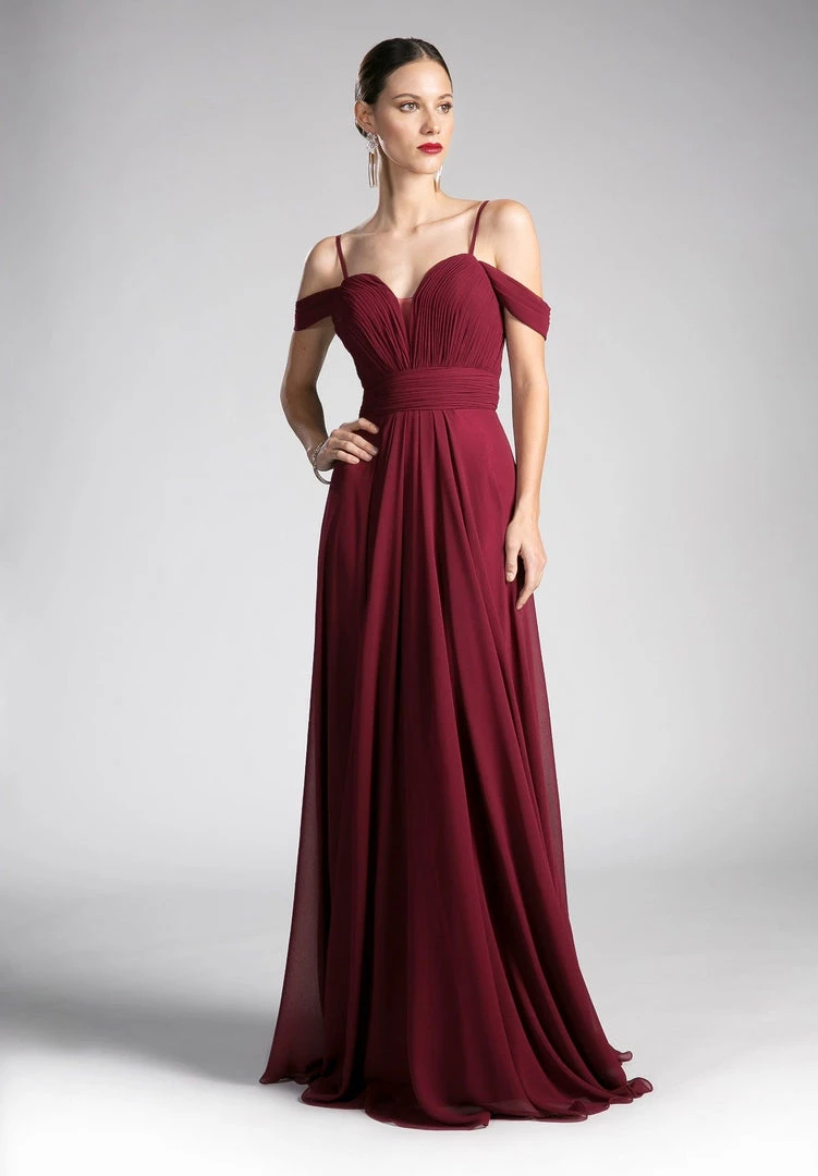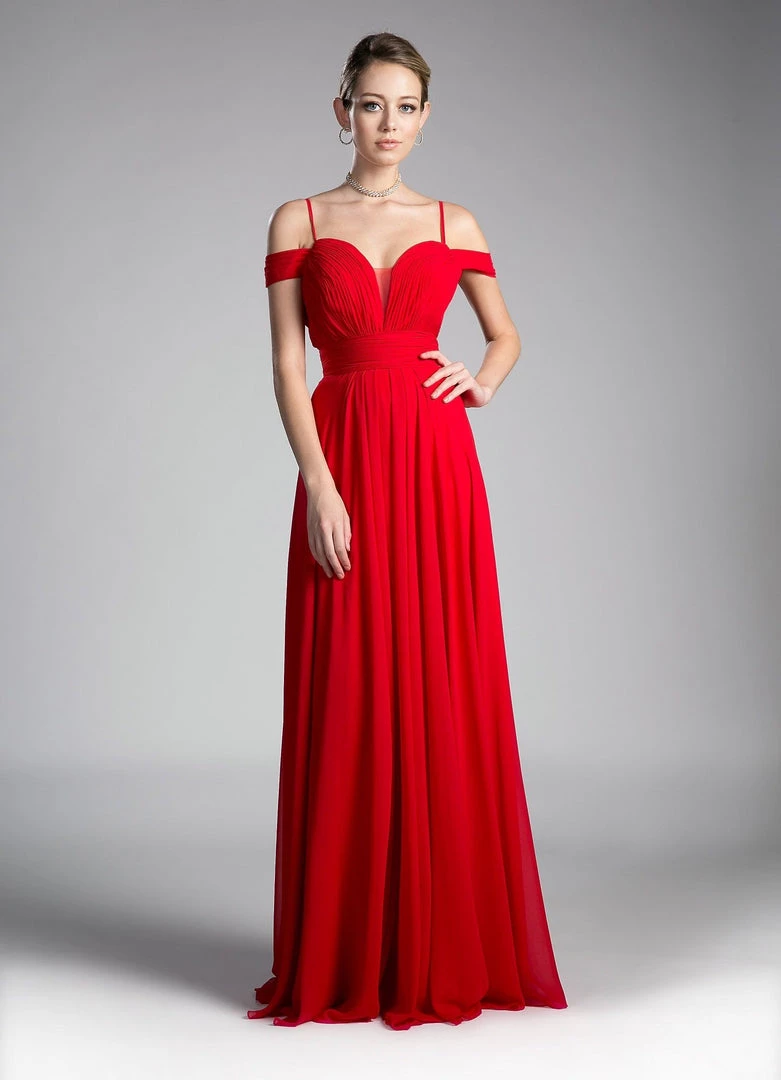 Think of how amazing you’ll look in this long ruched cold shoulder dress by Cinderella Divine CJ241. This chiffon evening gown features a ruched sweetheart bodice secured with a sheer illusion panel, open V-back, ruched waistband, a floor length A-line chiffon skirt, and a zipper closure.