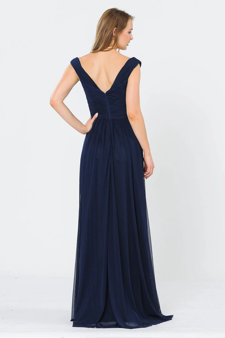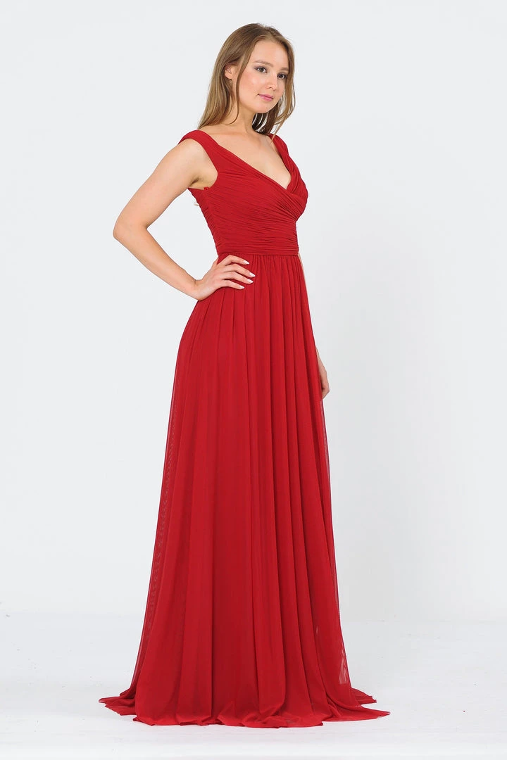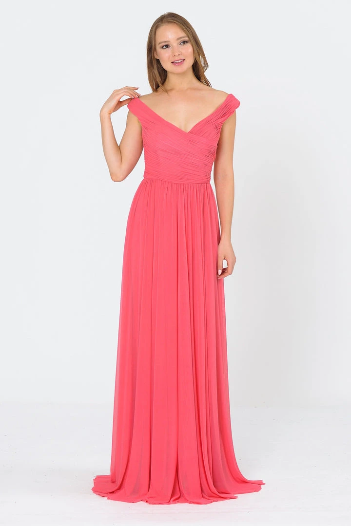 Look timeless in this long ruched off shoulder dress with open V-back by Poly USA 8398. This beautiful formal gown features a ruched off the shoulder bodice with a wide V-neckline, open V-back, floor length A-line skirt, and a zipper closure. Affordably priced under $150, this long evening dress is perfect for any formal event and will keep you on budget!