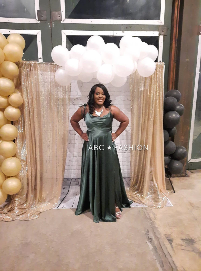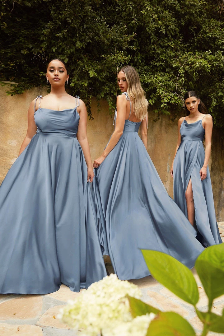 Be selfie ready in this long satin A-line dress by Cinderella Divine BD104. This beautiful satin gown features a cowl neckline with tying thin straps, leg slit, and a flowing A-line skirt.