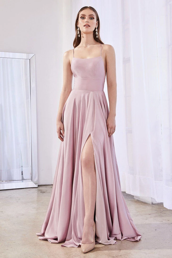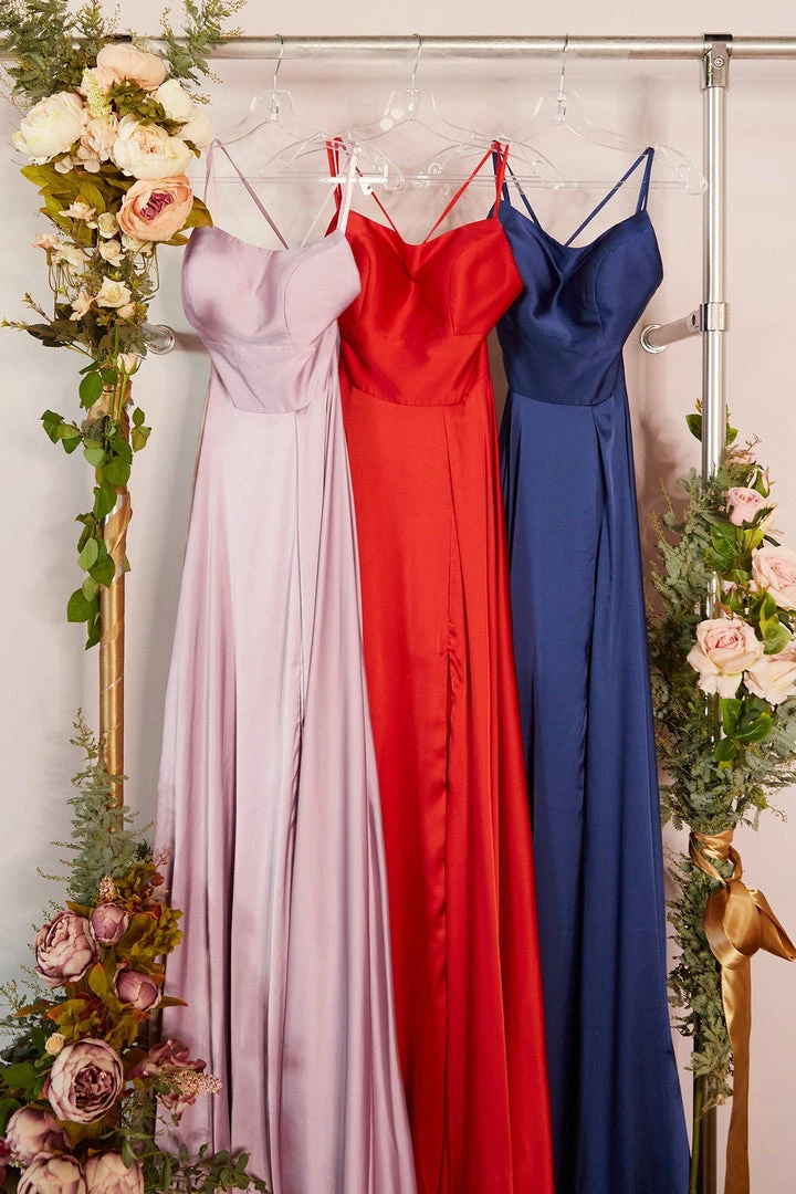 Look unforgettable in this long satin A-line dress with open crisscross back by Cinderella Divine CJ527. We love this A-line gown with straight across neckline and leg slit!