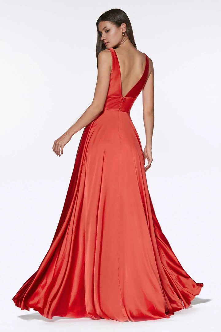 Receive lots of compliments in this long sleeveless V-neck dress with leg slit by Cinderella Divine 7469. We love this satin flowy A-line dress with leg slit, open back and V-neckline!