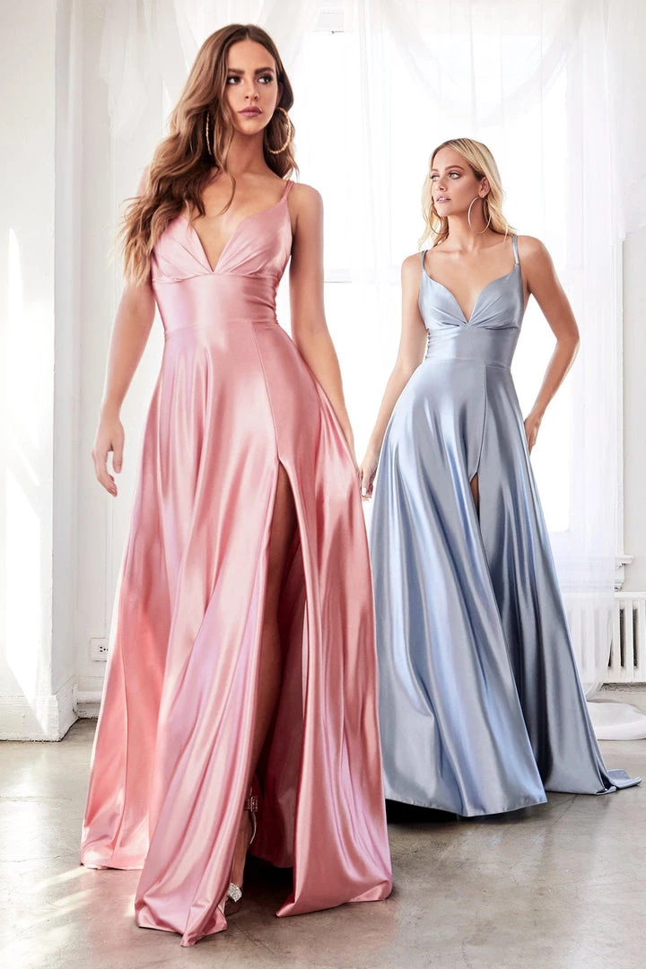Dance the night away in this long satin A-line dress with open back by Cinderella Divine CD903. We love this A-line gown with pleated V-neckline and leg slit!