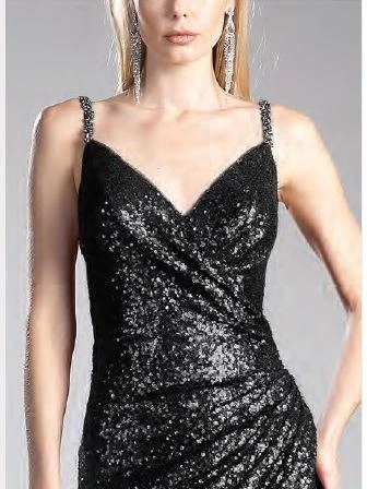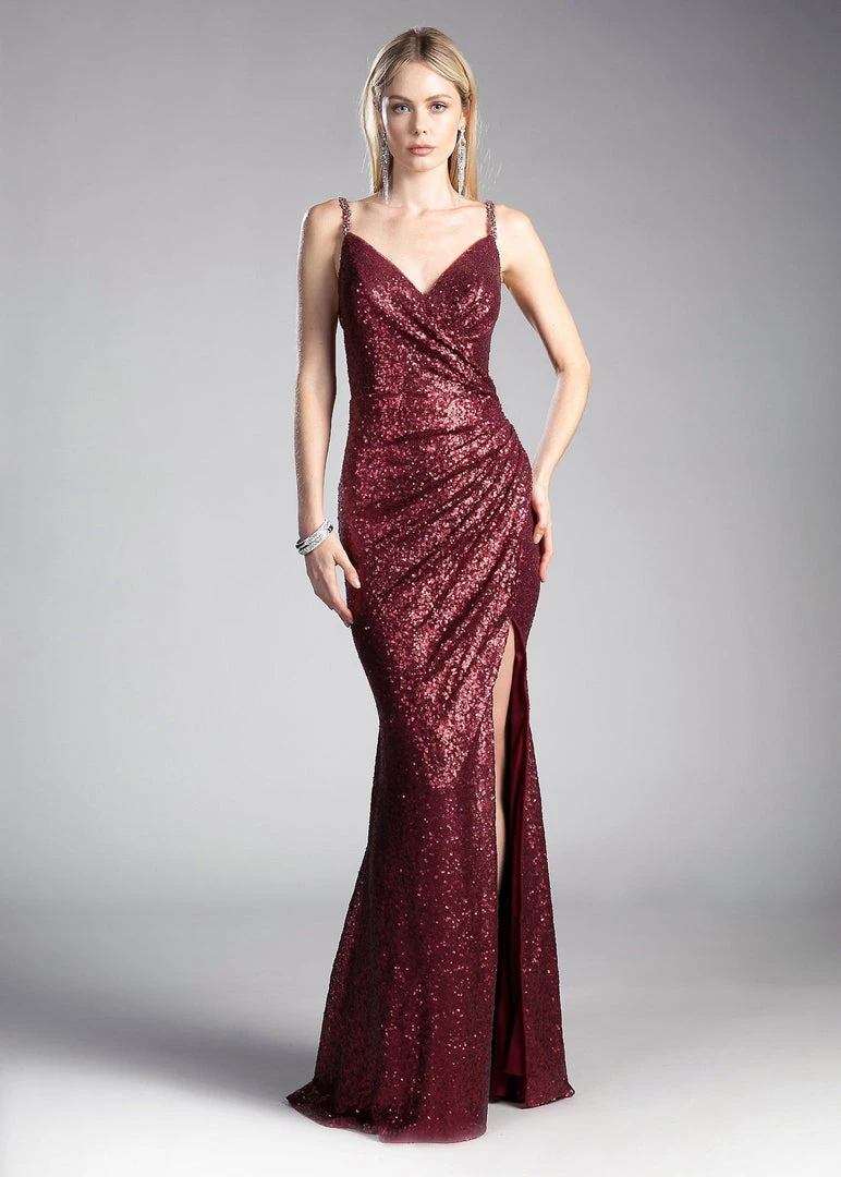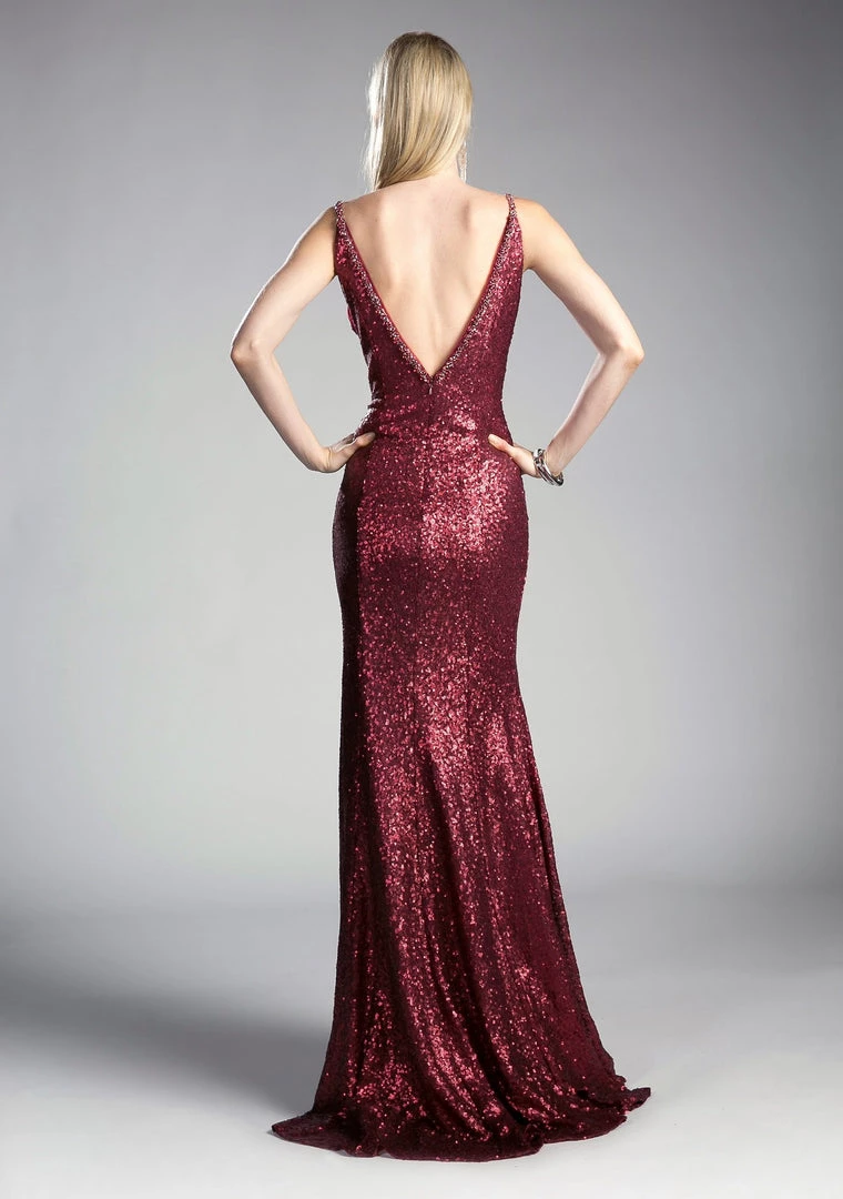 Dance the night away in this long sleeveless sequined V-neck dress with open back by Cinderella Divine CR811. This sequined evening gown features a sleeveless V-neck bodice, beaded straps, this dress is covered in sparkly sequins, a V-shaped open back, a floor length fit and flare skirt with side slit, and a zipper closure.