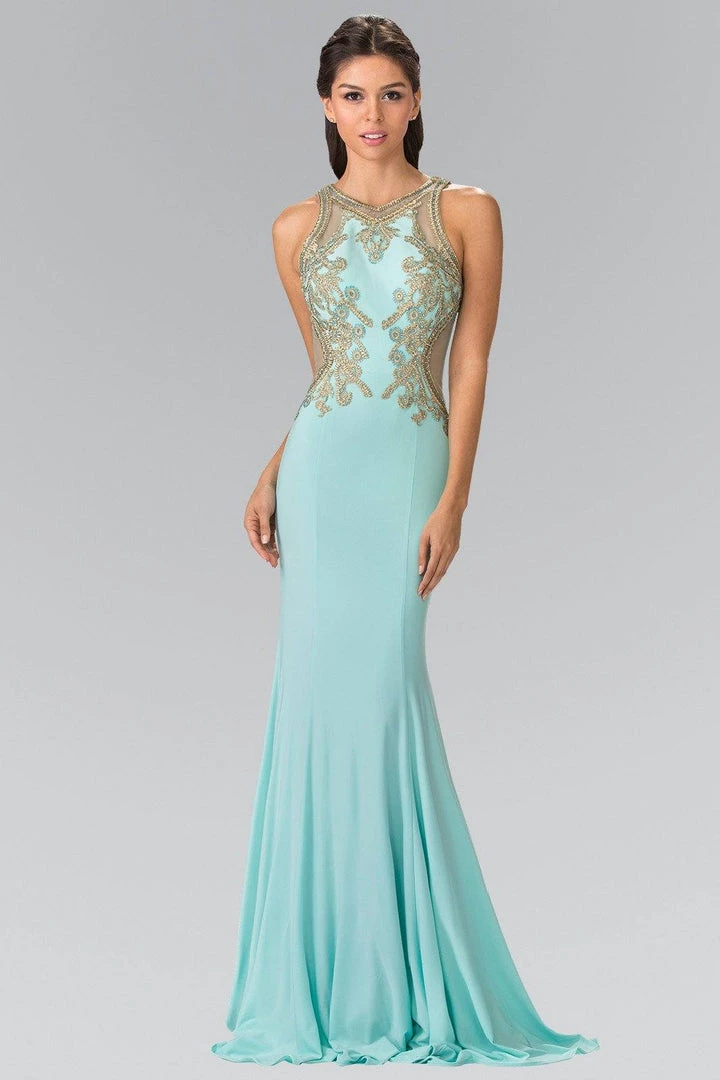 All eyes will be on you in this long sleeveless bead embroidered illusion jersey dress by Elizabeth K.