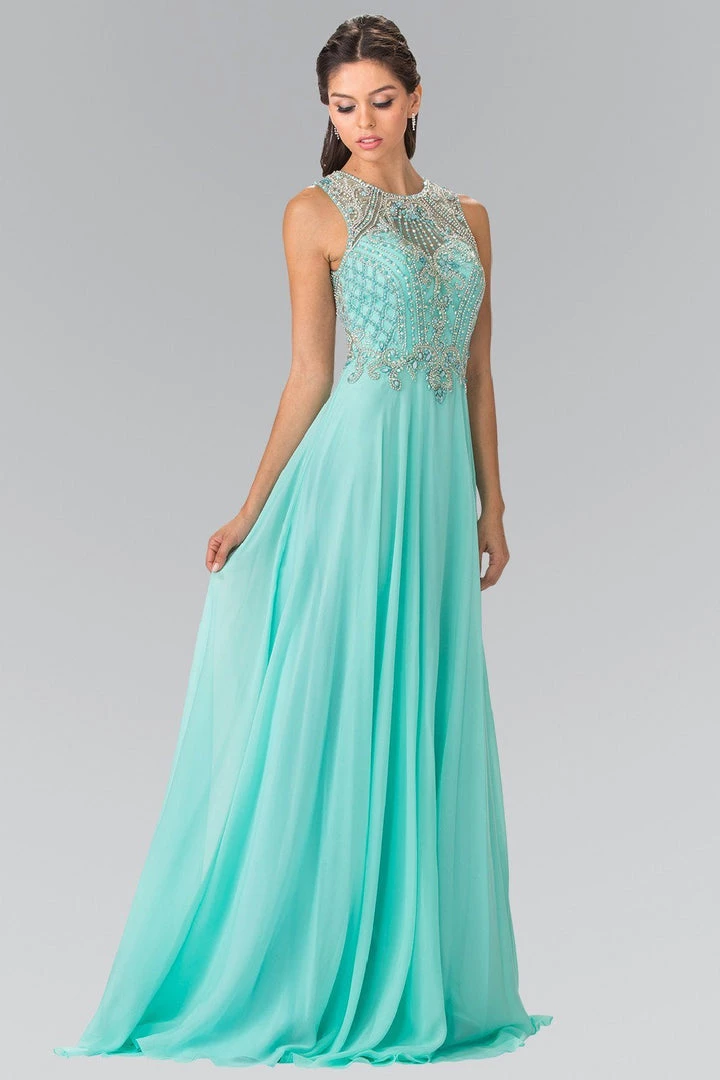 You’ll be the life of the party in this long sleeveless beaded illusion chiffon dress by Elizabeth K.