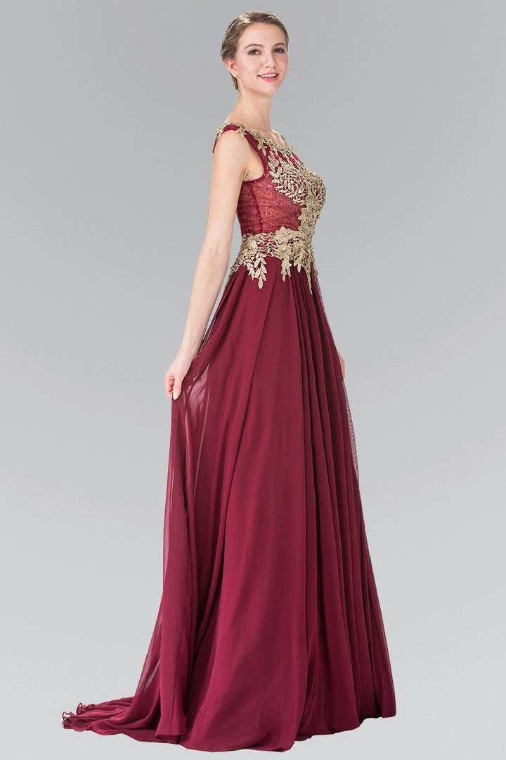 Be a trendsetter in this long sleeveless illusion dress with floral lace top by Elizabeth K.
