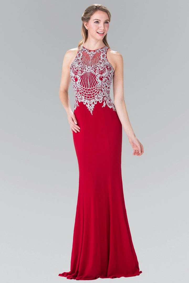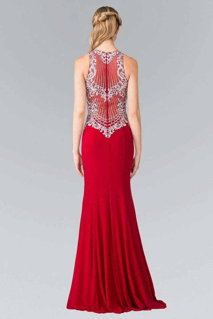 Command attention in this long embroidered sleeveless dress with illusion bodice by Elizabeth K. Made out of jersey, this beautiful gown features a sheer neckline adorned beaded embroidery and a sheer embellished back.
