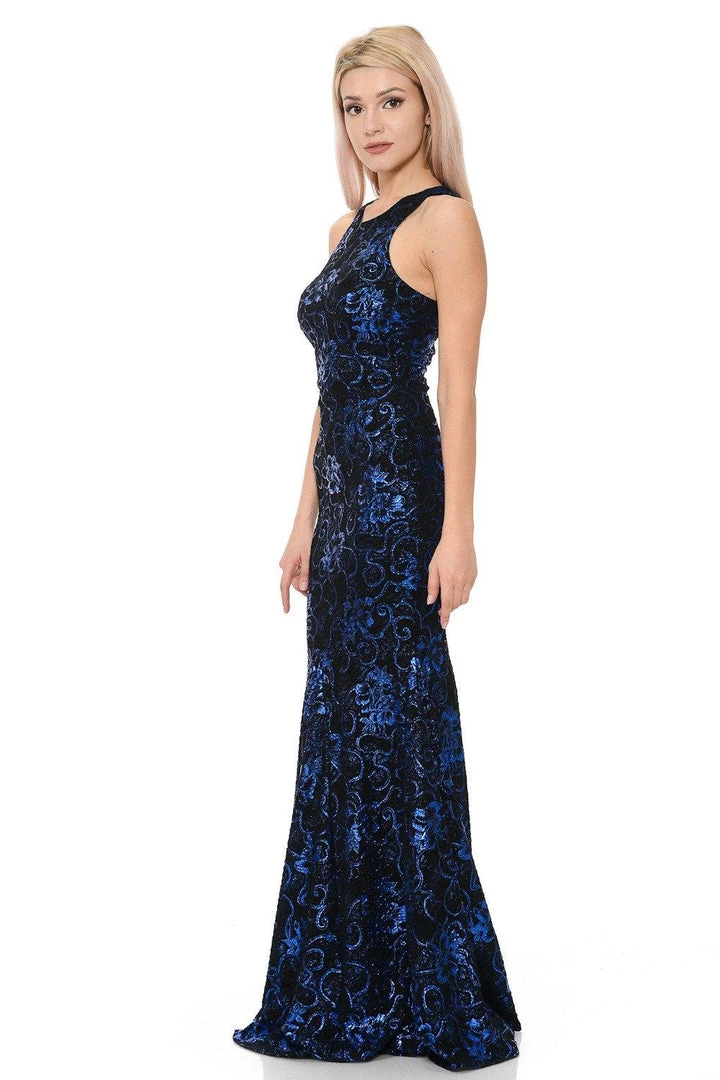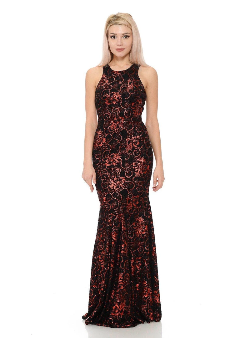 Look unforgettable in this long sequined floral dress by Lenovia. This long evening gown features a high neck sleeveless bodice, beautiful floral embroidery accented with sequins, open back, a full length skirt, and a zipper closure. Perfect for any formal event!