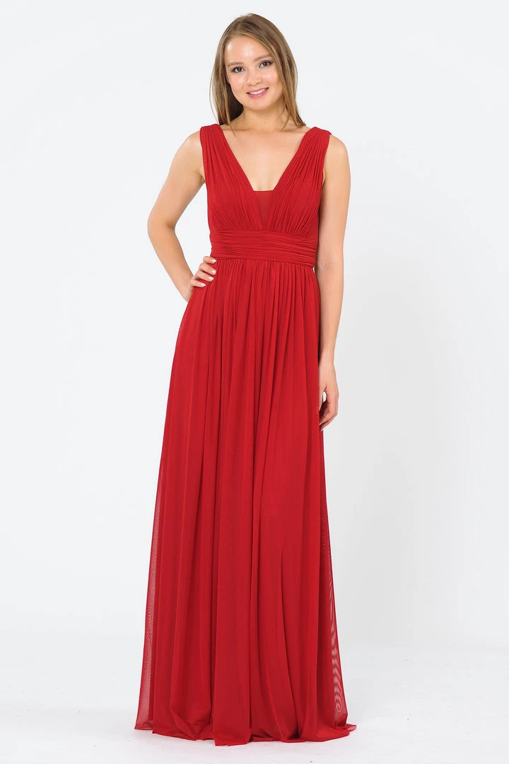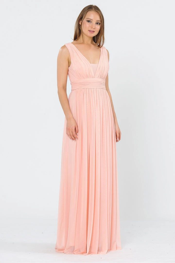 Look timeless in this long V-neck dress with open V-back by Poly USA 8408. This beautiful formal gown features a ruched sleeveless V-neck bodice secured with an inset panel, open V-back, floor length A-line skirt, and a zipper closure. Affordably priced under $150, this long evening dress is perfect for any formal event and will keep you on budget!