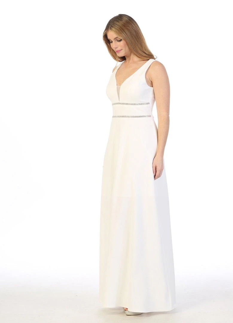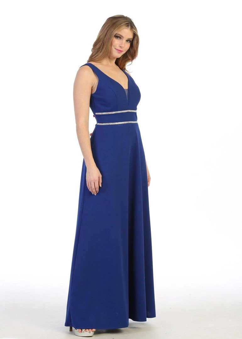 Look unforgettable in this long sleeveless V-neck A-line dress by Celavie 6493L. Long sleeveless jersey dress with illusion V-neckline, rhinestone embellished waistbands, open V-back, floor length A-line skirt, and a zipper closure. Affordably priced at $139, this evening gown is perfect for any formal event and will keep you on budget!