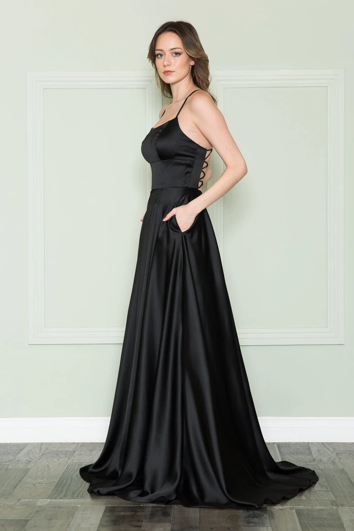 Make memories in this long square A-line dress with by Poly USA 8910. This beautiful gown features square neckline bodice, open back, lace-up back with adjustable straps, floor length A-line skirt with a sweep train, side leg slit, hand pockets, and a zipper closure.