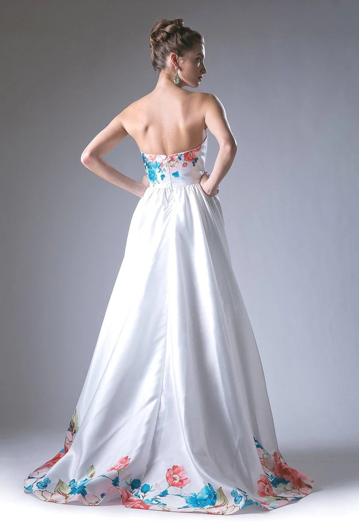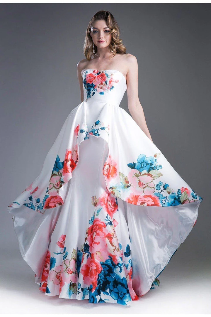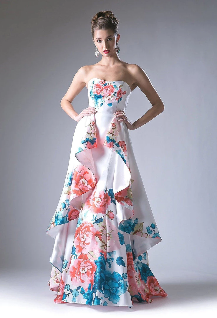 All eyes will be on you in this long strapless floral print dress by Cinderella Divine 71375.