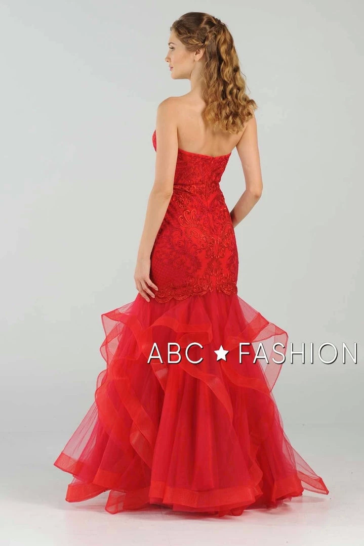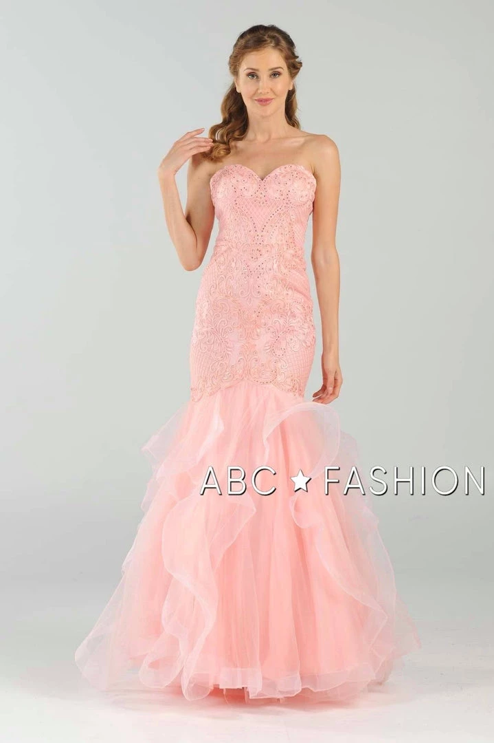 Look picture-perfect in this strapless sweetheart mermaid gown with tiered skirt by Poly USA 8198. Stunning mermaid mesh dress features a strapless sweetheart bodice embellished with embroidery and rhinestones, floor length tiered skirt with horsehair hemline ruffles, and a zipper closure. Affordably priced under $270, this dress is perfect for any formal event and will keep you on budget!