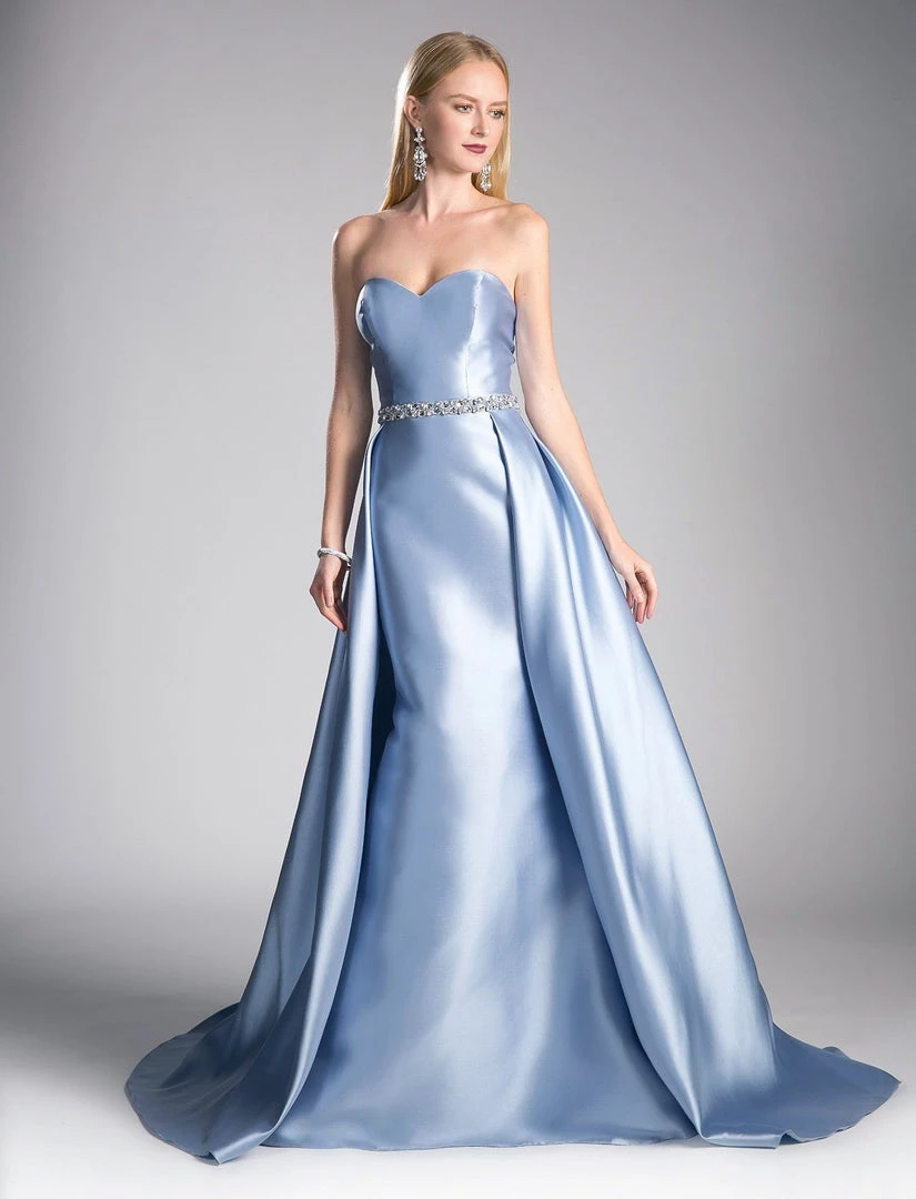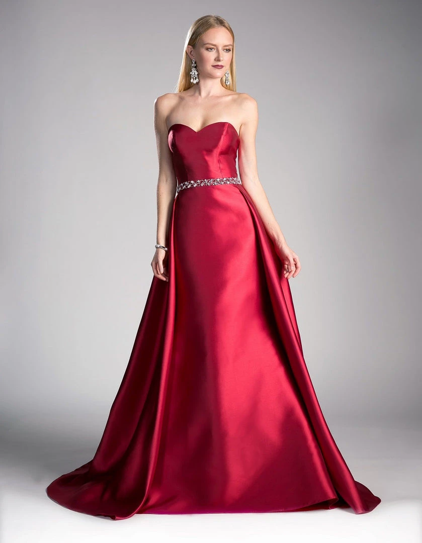 - Strapless mikado fitted gown with over skirt and beaded belt
