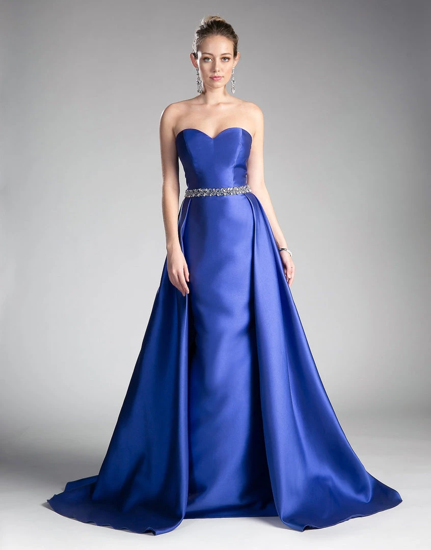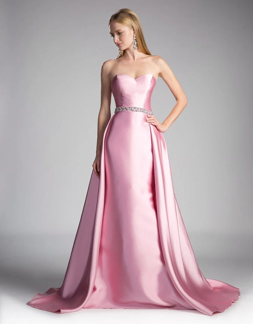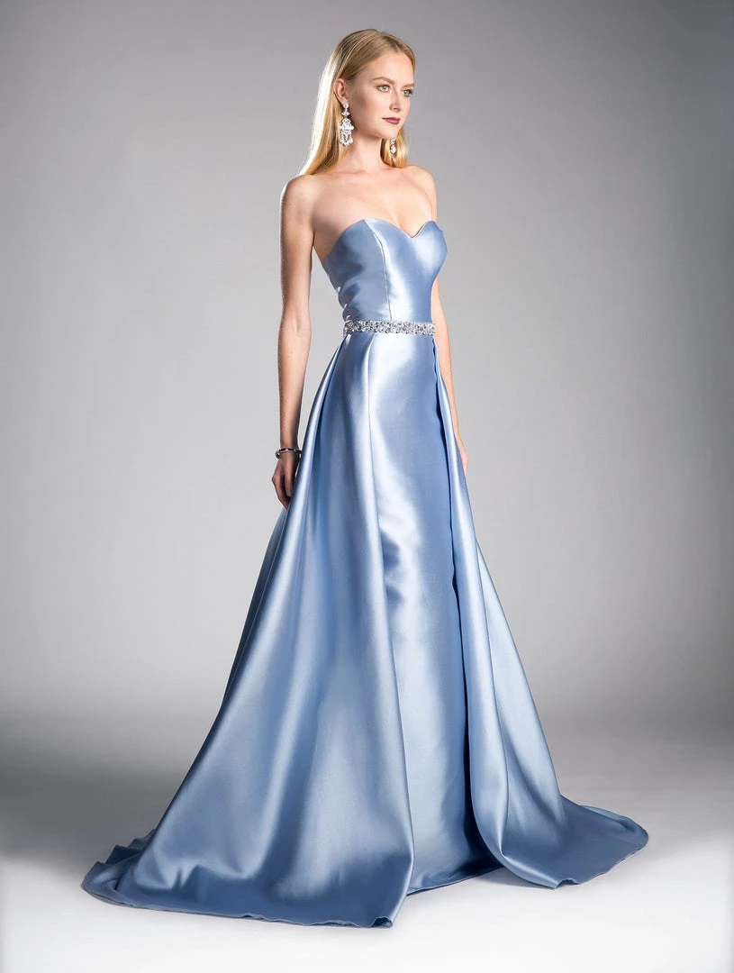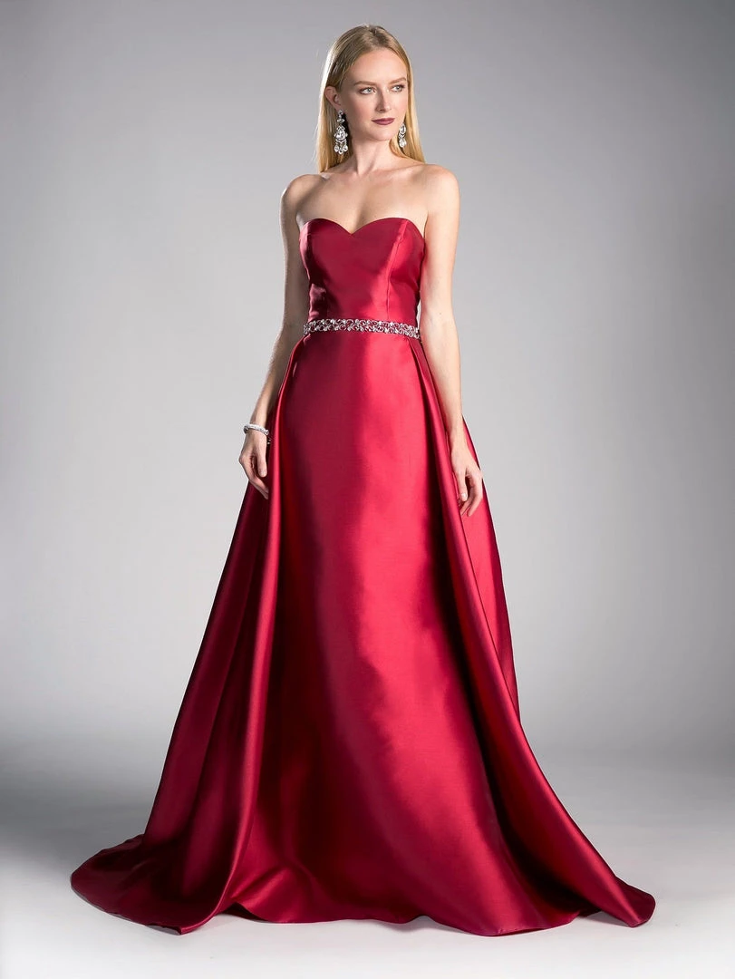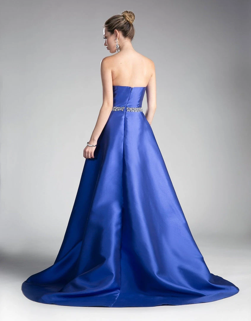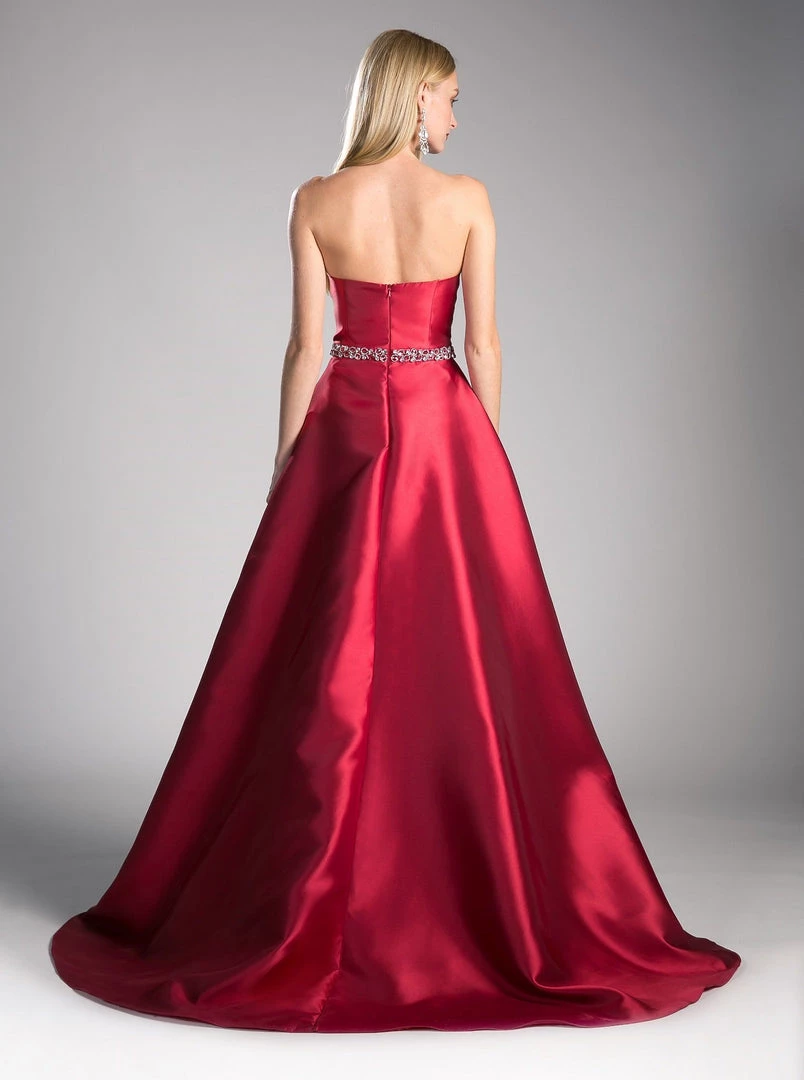 Look picture-perfect in this long strapless A-line formal dress with beaded waistline by Cinderella Divine 455. This mikado evening gown features a strapless bodice with a sweetheart neckline, rhinestone embellishments help define the waist, dramatic pleated sides, a floor length A-line skirt with a small train, and a zipper closure.