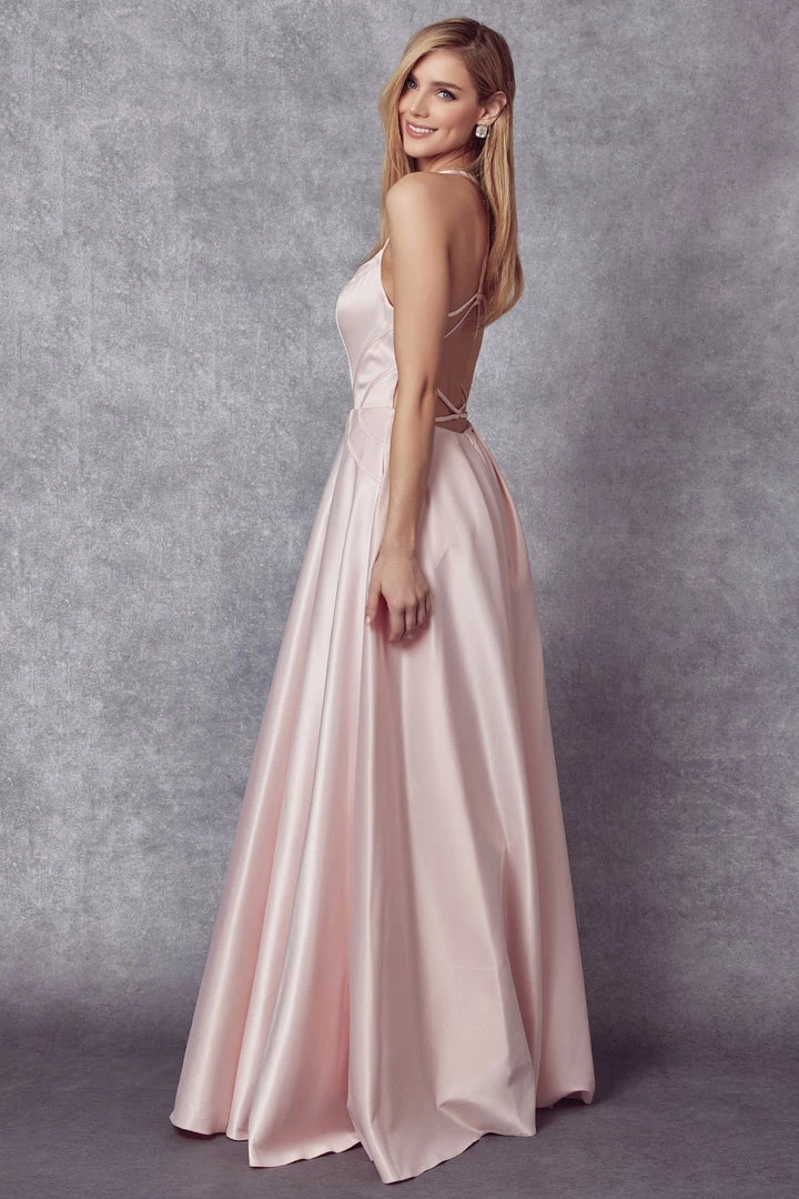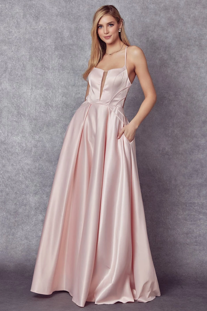 Look timeless in this in this long sleeveless satin dress with A-line skirt by Juliet 687. The illusion v-neckline, bodice, and open back add a touch of regal elegance. Included are side pockets with a flowing sweep train to leave that perfect impression.