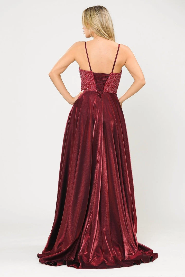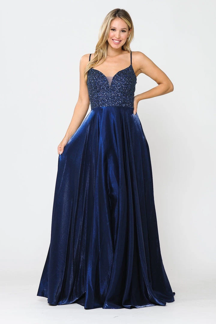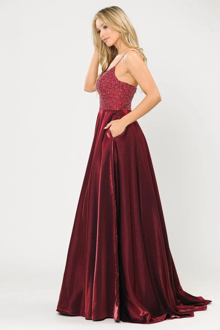 Dazzle the room in this long satin A-line dress with beaded sweetheart bodice by Poly USA 8674. This beautiful formal gown features a sleeveless illusion sweetheart bodice secured with spaghetti straps, flirty open corset back, side pockets, floor length A-line skirt with a sweep train, and a lace-up back. Affordably priced at $370, this long evening dress is perfect for any formal event and will keep you on budget!