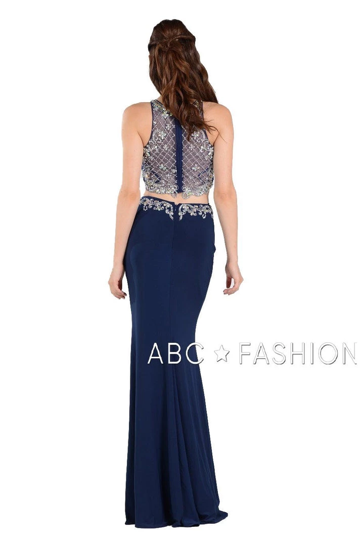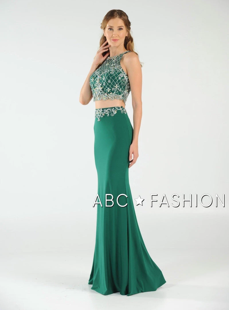 Show off your curves in this two-piece gown with bead embroidered crop top by Poly USA 7926. Gorgeous two-piece dress with beaded sleeveless scoop-neck crop top, bead embellished waistline, floor length form fitting skirt, beaded sheer back, and a back zipper closure. Affordably priced under $250, this dress is perfect for any formal event and will keep you on budget!