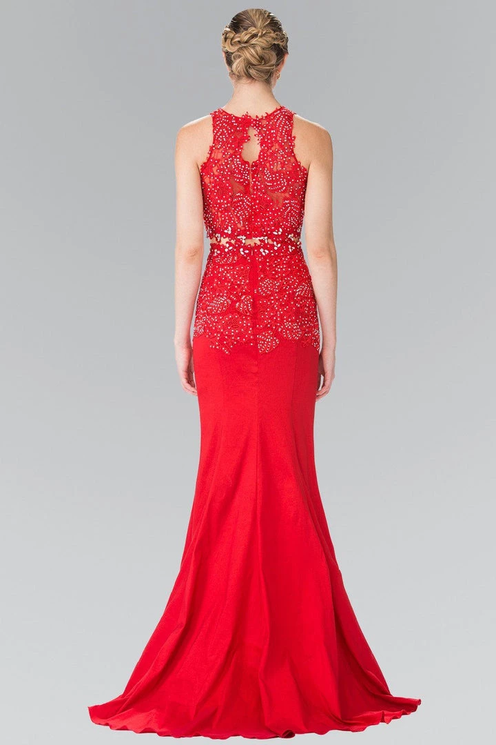 Command attention in this long beaded two piece dress with lace embroidery by Elizabeth K. Made out of taffeta, this beautiful two-piece gown features lace embroidered applique, beaded accents, and a sheer back.