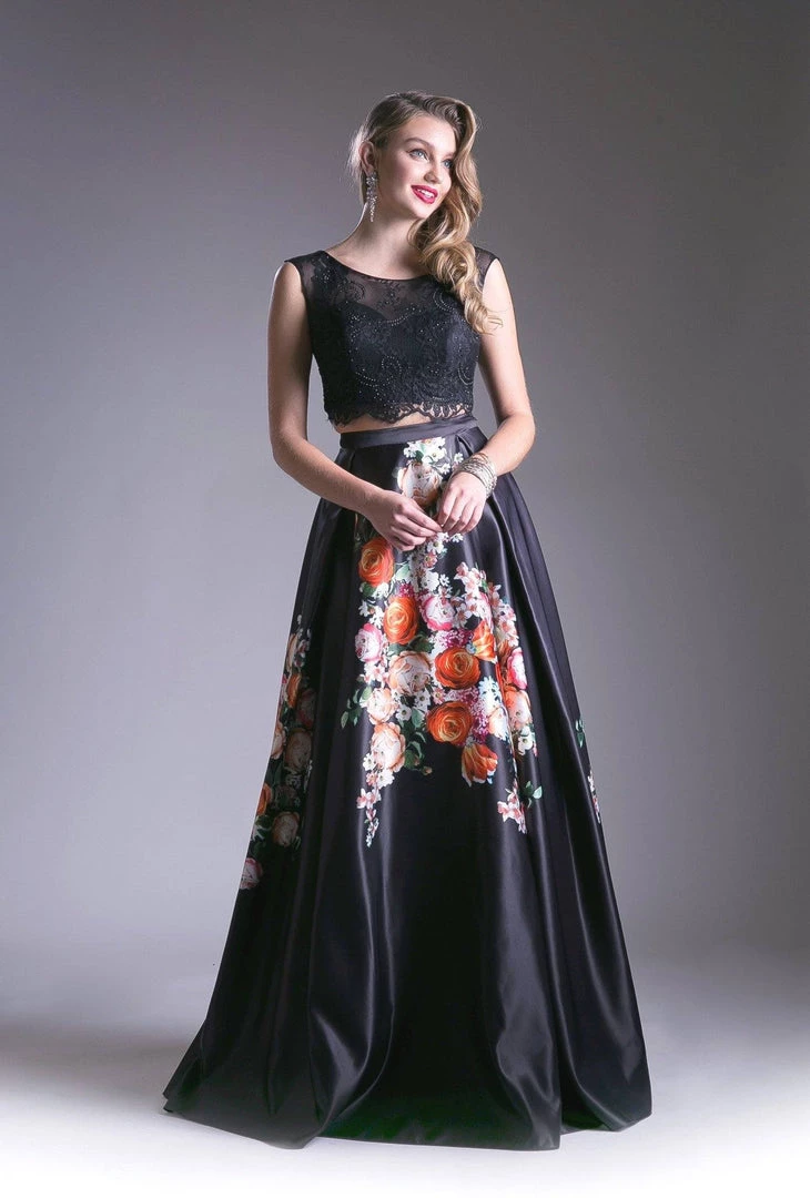 Dance the night away in this long two-piece A-line dress with floral print satin skirt by Cinderella Divine KC1813.