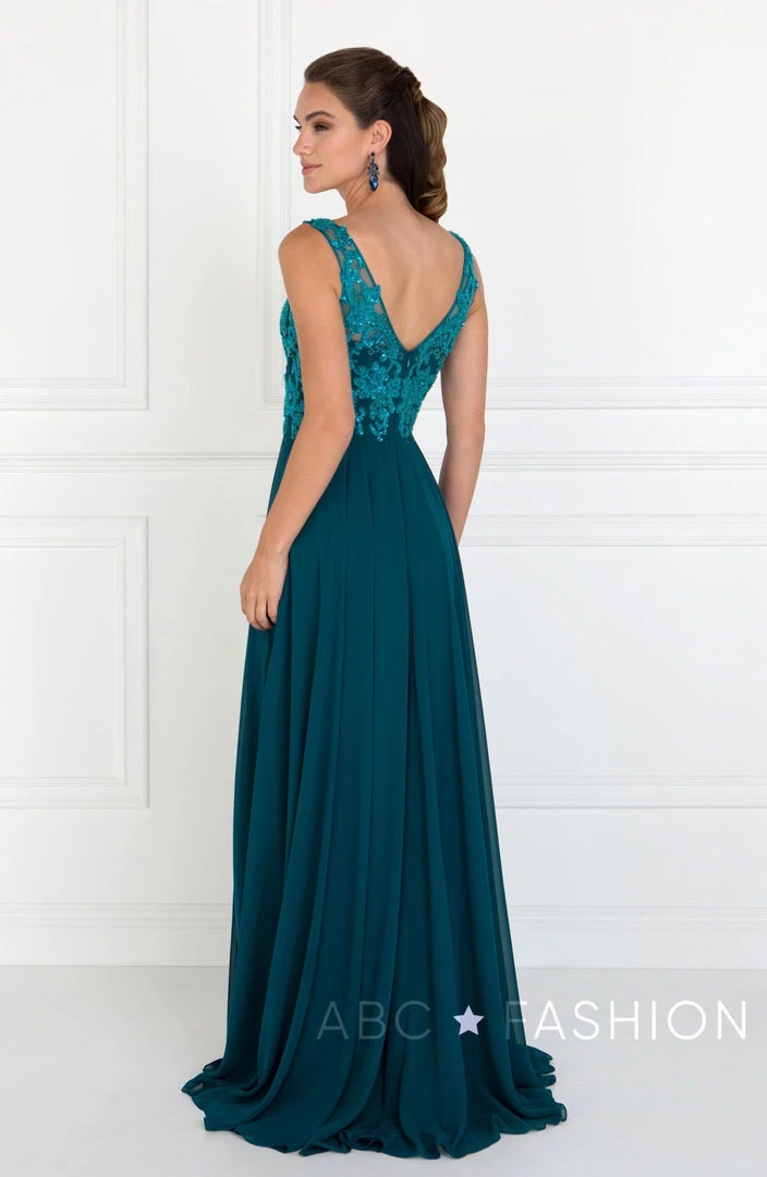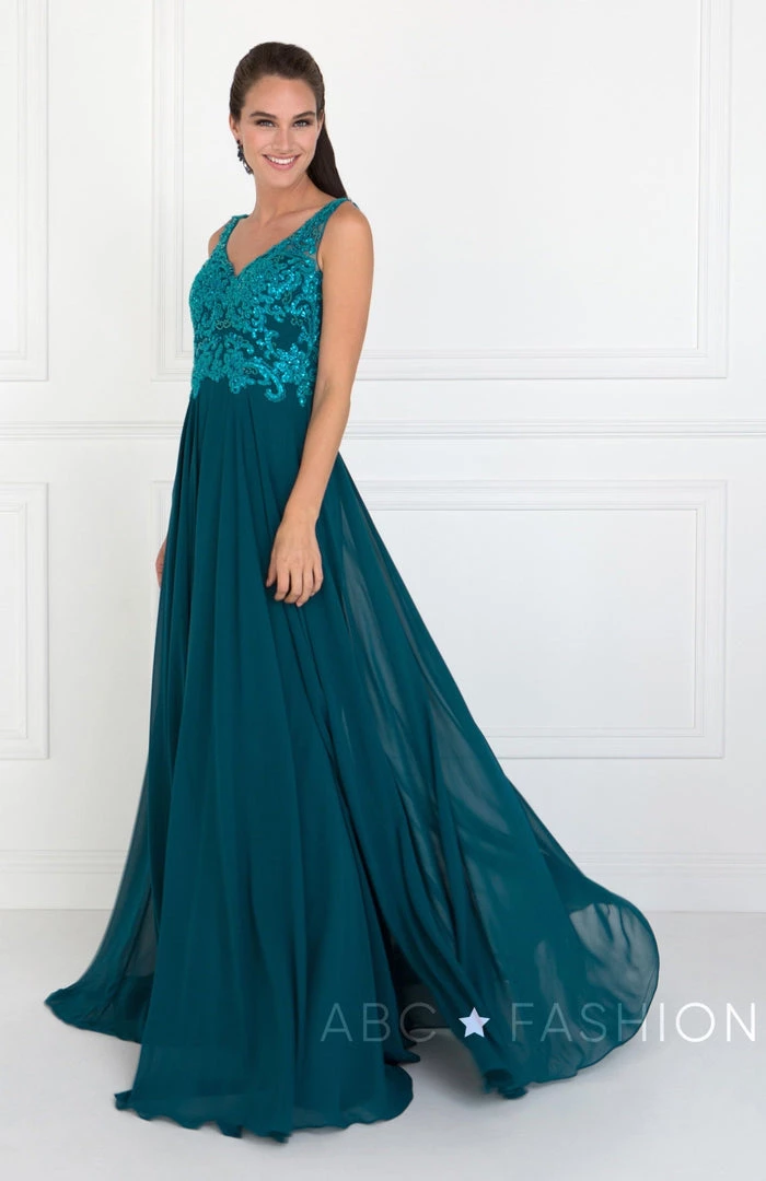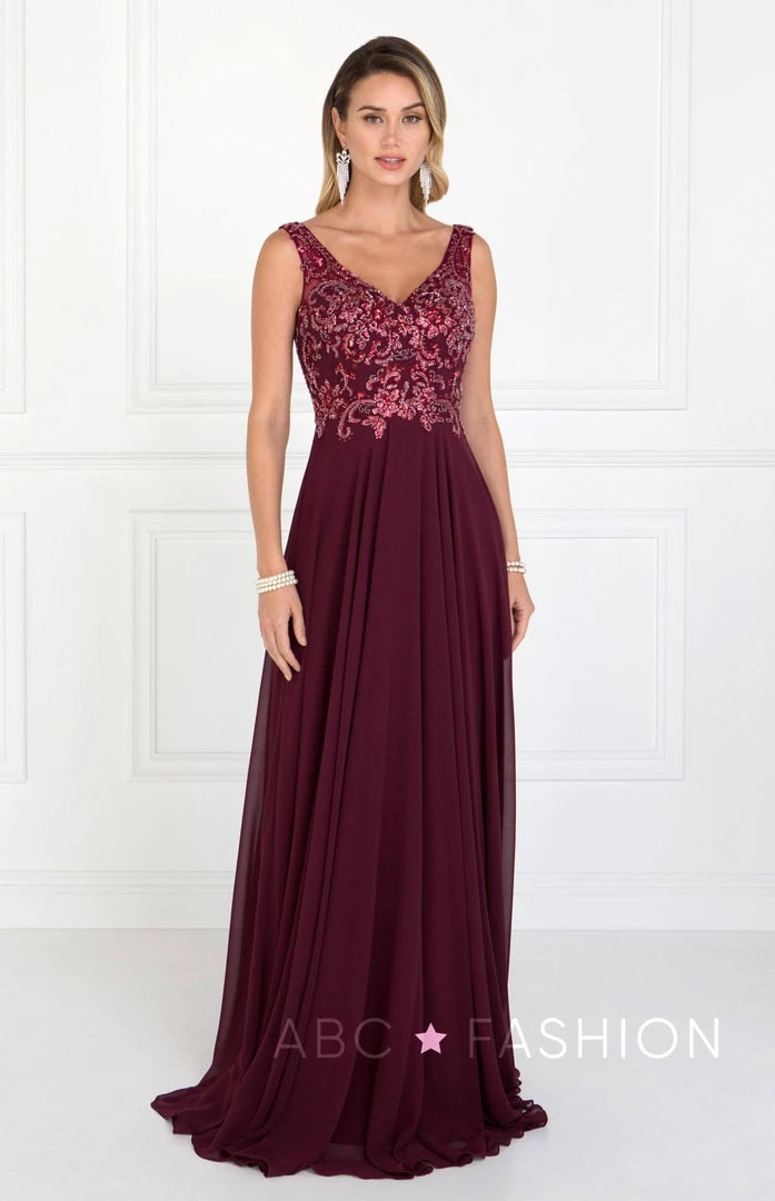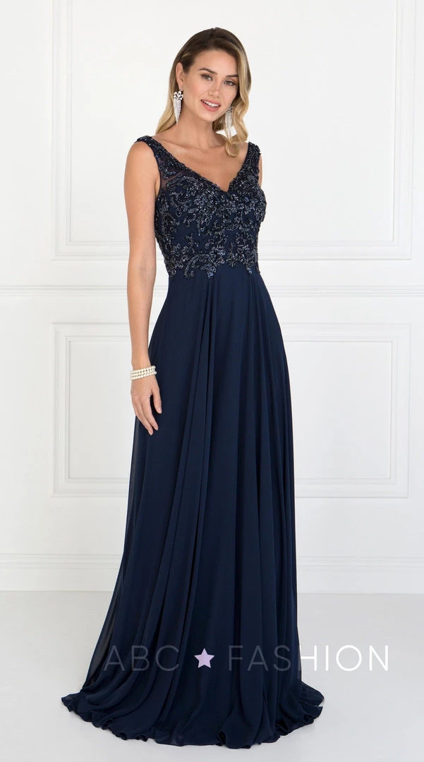 Look radiant in this sleeveless chiffon gown with beaded V-neck bodice by Elizabeth K GL1567. Sleeveless chiffon dress with a V-neckline on an A-line silhouette. This gown features a drop open back, beaded embroidery with soft jewel placement throughout the bodice, and a zipper closure. Perfect for any formal!