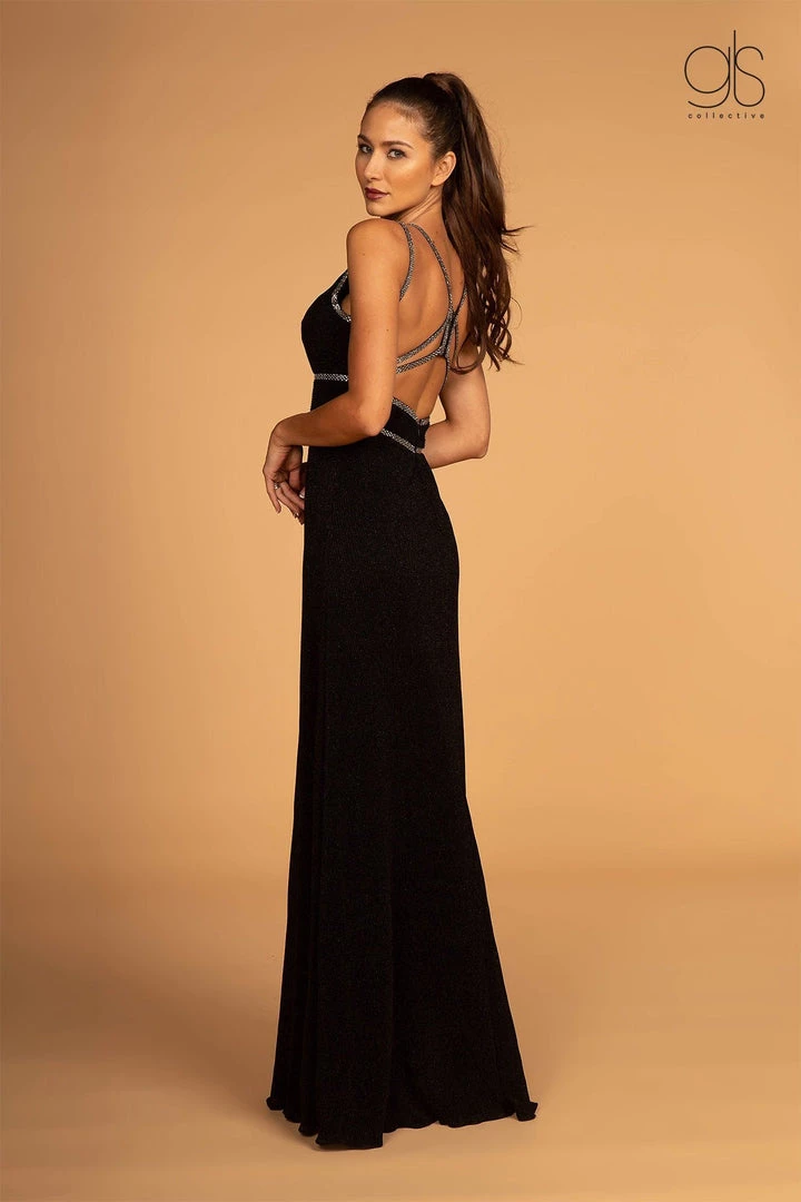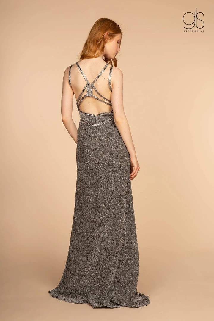 Captivate the room in this V-neck metallic glitter gown with bead embellished waistbands by Elizabeth K GL2503.