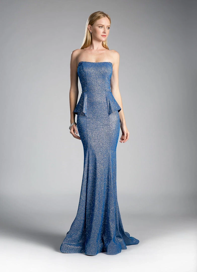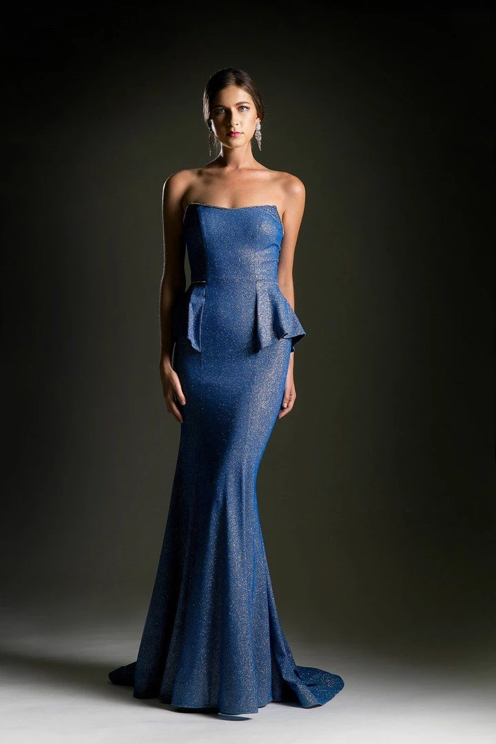 Add a touch of sparkle to the room in this long strapless glitter mermaid dress with peplums by Cinderella Divine 5025. This evening gown features a beautiful straight across strapless bodice accented with beads, a floor length mermaid godet fitted skirt with a small train, and a zipper closure.