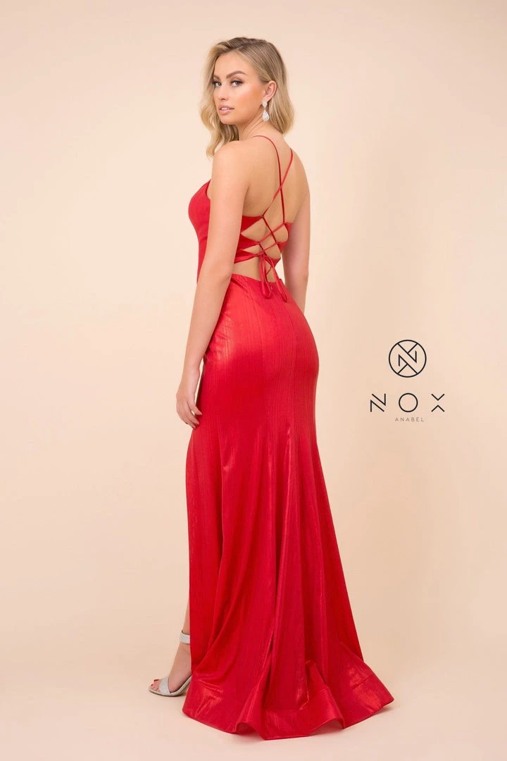 Be a trendsetter in thisĀ long fitted metallic spandex dress with open corset back by Nox Anabel M413.