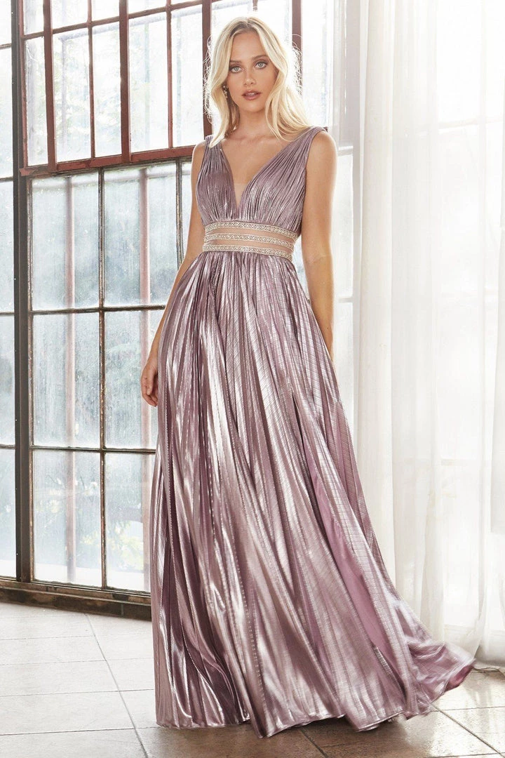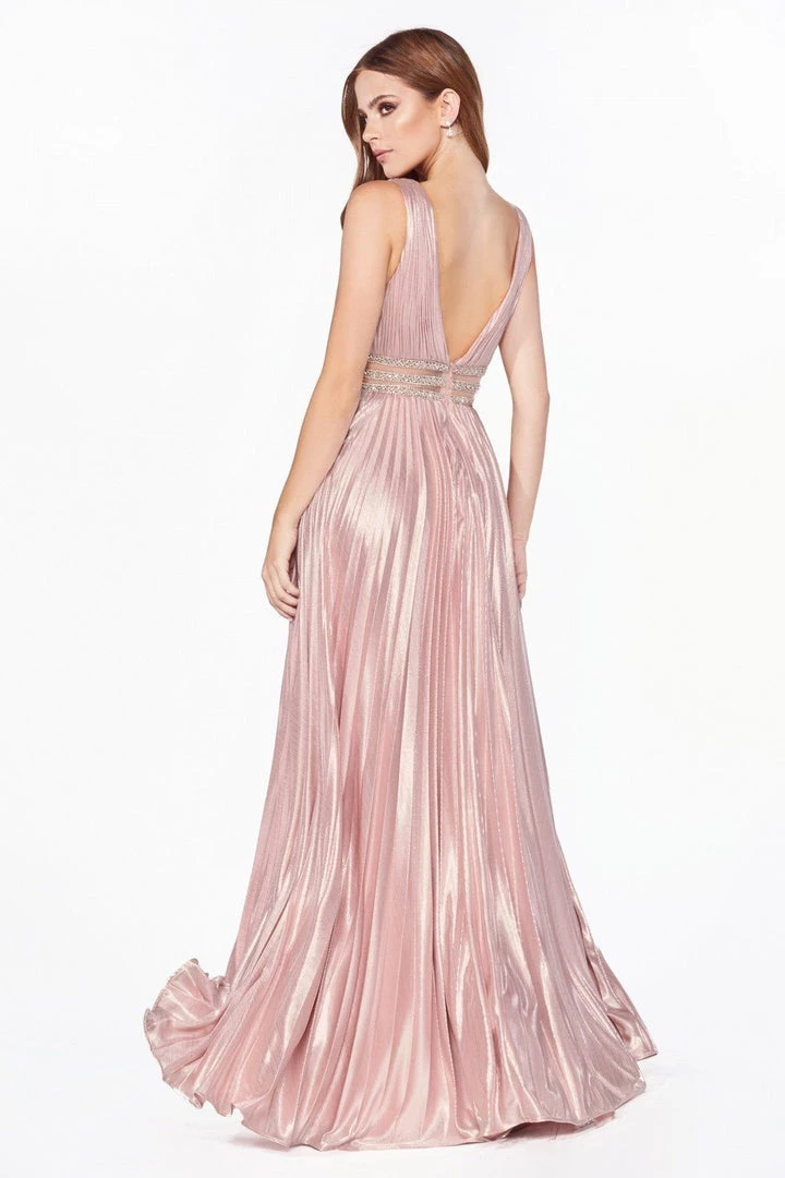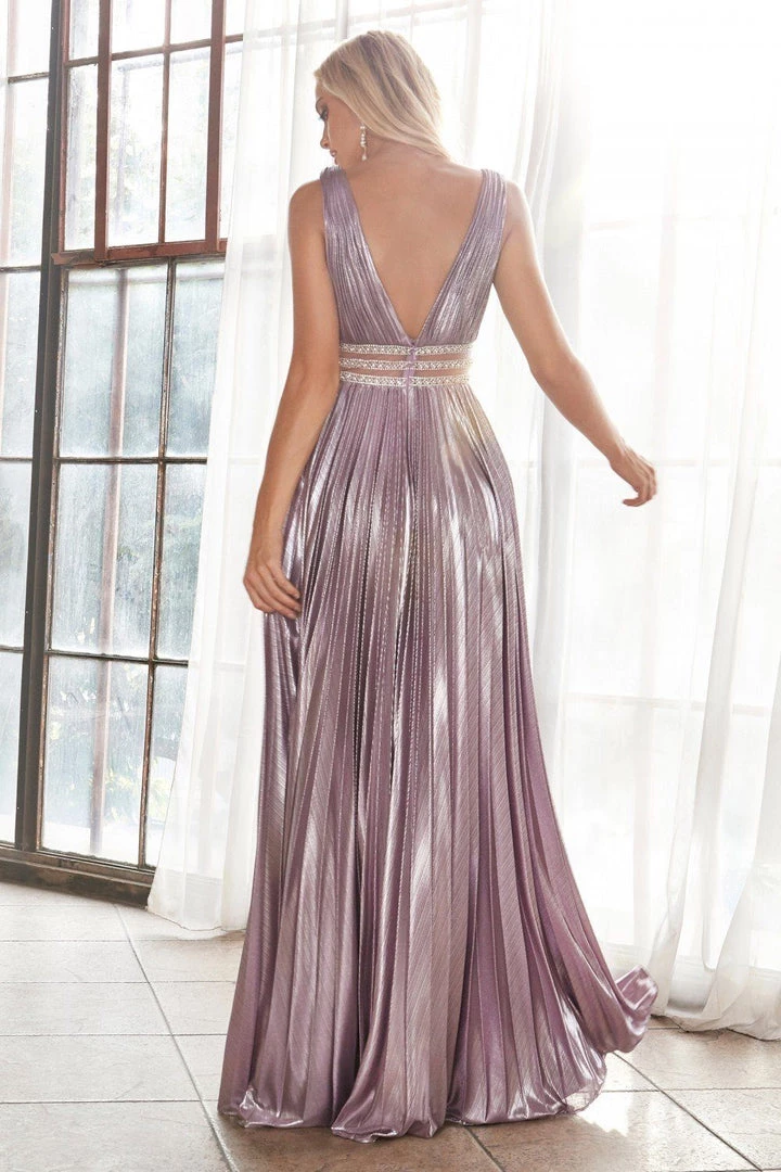 - A-line metallic pleated gown with deep v-neckline and beaded belts