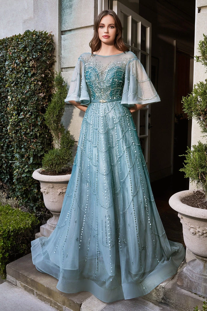 Look modest chic in this beaded mid-sleeve tulle dress with A-line skirt Cinderella Divine B719. This beautiful gown features a sheer sweetheart bodice, mid sleeves, open lace-up corset back, and a full length A-line skirt that ends in a sweep train.