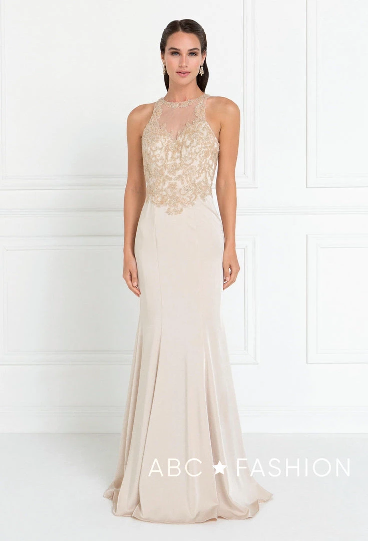 Look and feel beautiful in this long navy blue dress with bead embellished illusion bodice by Elizabeth K GL1568. Sleeveless high-neck full length dress on a mermaid silhouette. Sheer embroidered back with zipper close. Full front sequin embroidery detail with soft jewel placement on a solid one tone. Perfect for any formal event!