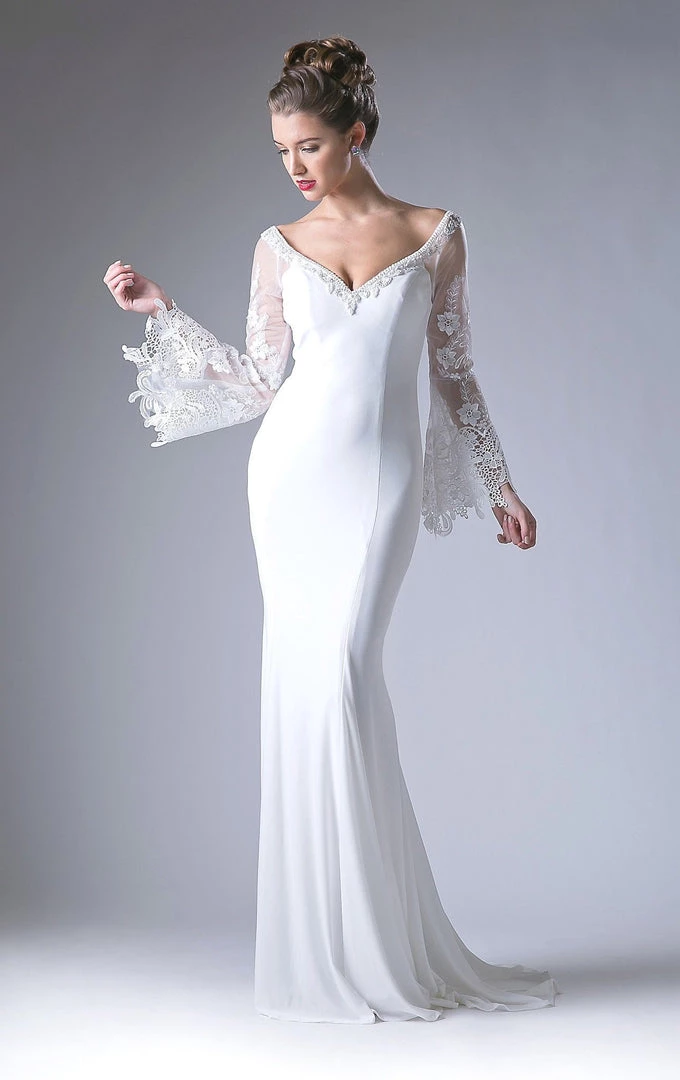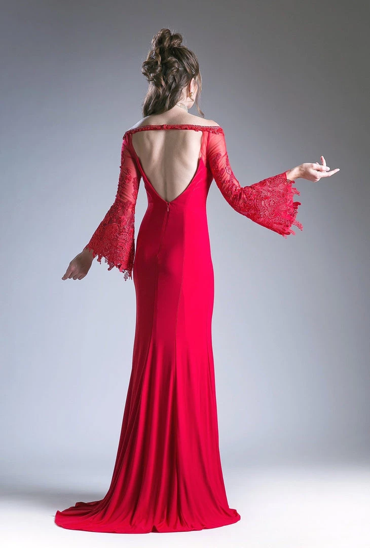 Look picture-perfect in this long off shoulder trumpet dress with lace bell sleeves by Cinderella Divine 71272.