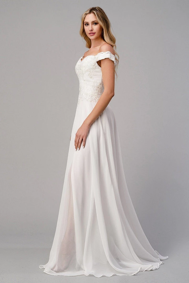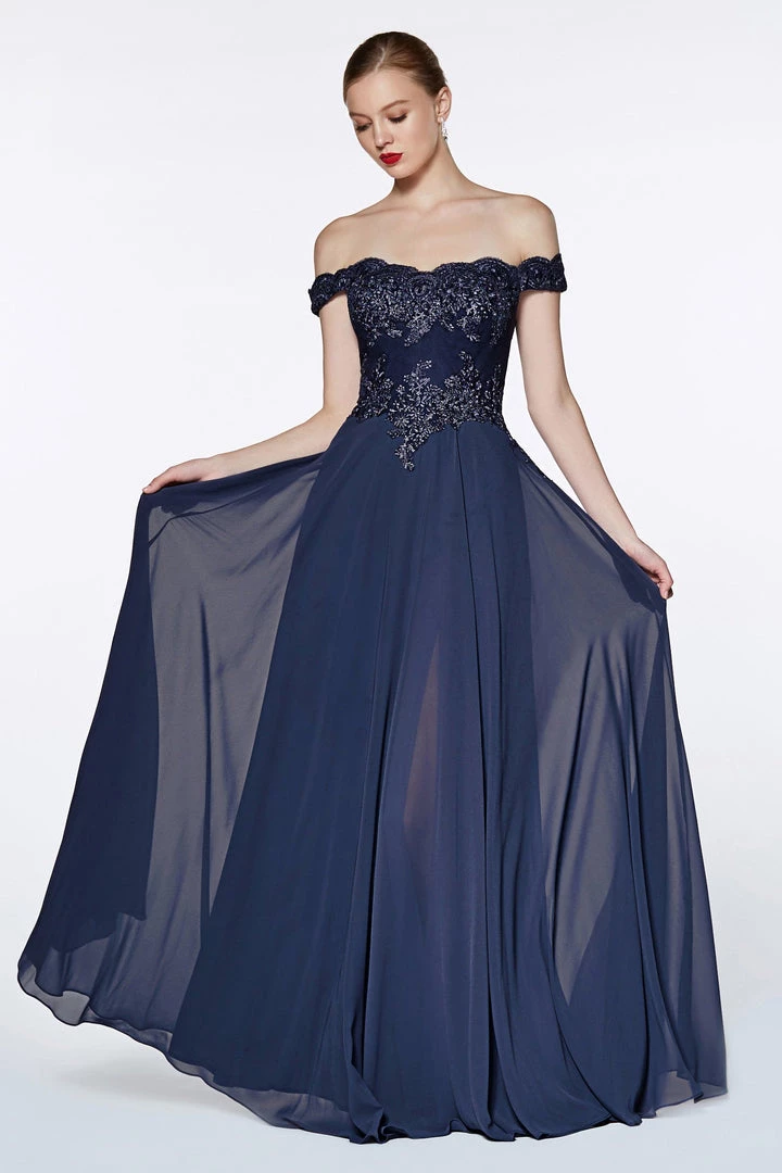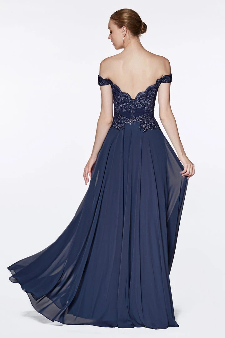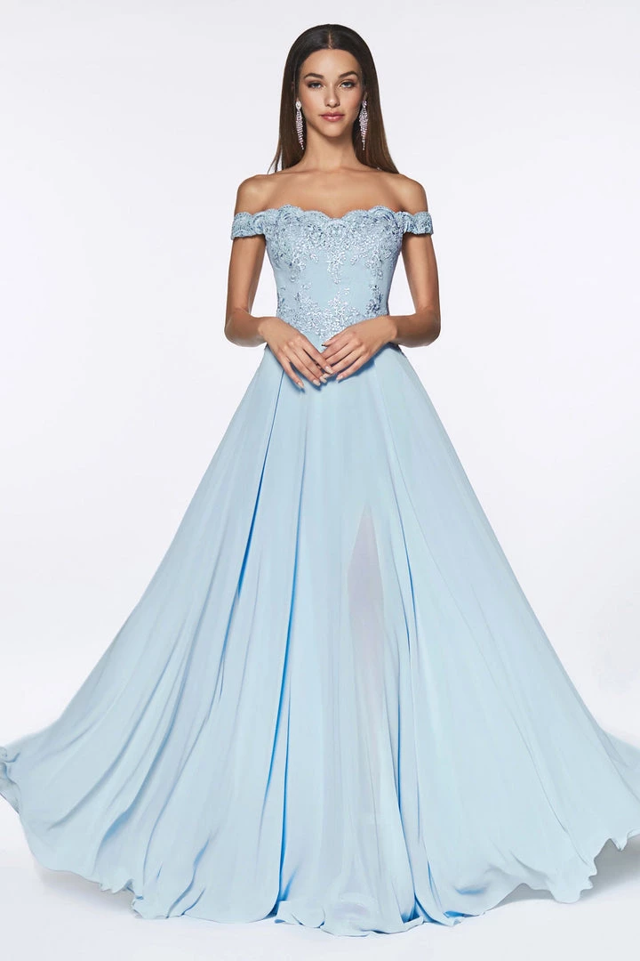 Turn heads in this long off the shoulder dress with lace bodice by Cinderella Divine 7258. We love this off the shoulder lace bodice gown with flowy chiffon skirt and leg slit in lining!