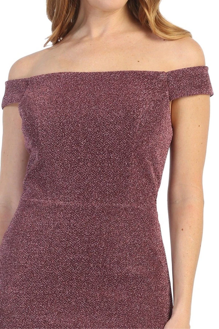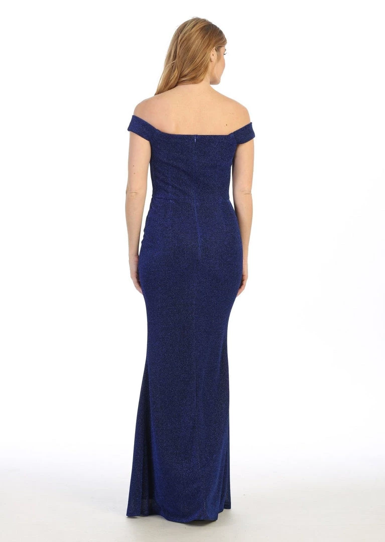 Sparkle under the stars in this fitted off the shoulder glitter evening dress by Celavie 6402. This beautiful metallic glitter formal gown features a straight across bodice with off shoulder bodice with mid-length sleeves, floor length mermaid skirt, and a zipper closure. Affordably priced at $139, this long evening dress is perfect for any formal event and will keep you on budget!