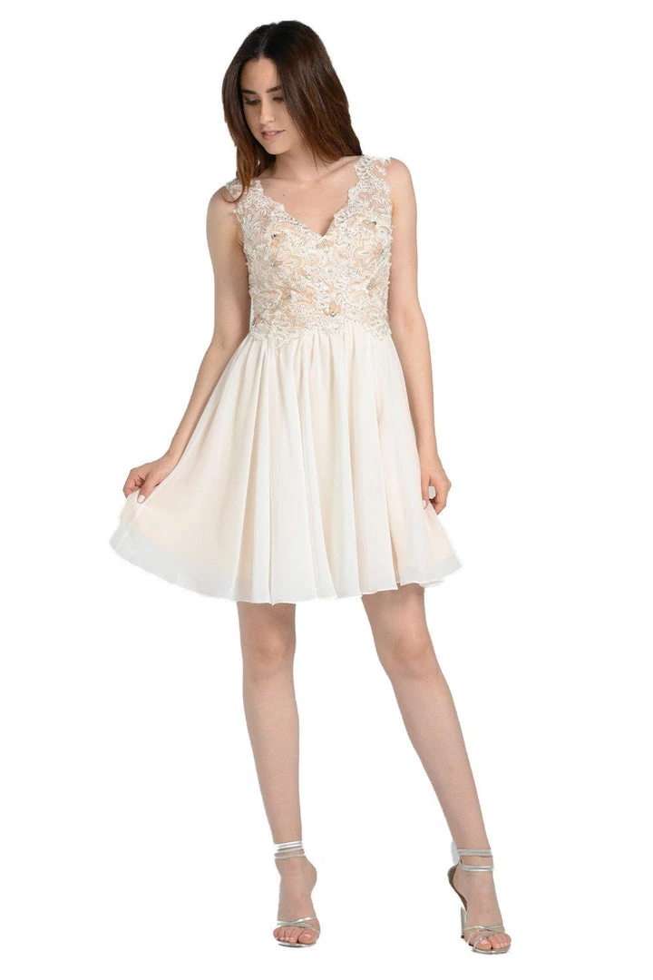 Be picture-ready in this short off-white chiffon dress with beaded lace bodice by Poly USA 7638. This cocktail dress features a sleeveless V-neck lace bodice accented with sparkly beads. A flirty V-shaped open back, a short A-line skirt, and a zipper closure complete this beautiful look. Affordably priced under $200, this dress is perfect for any formal event and will keep you on budget!